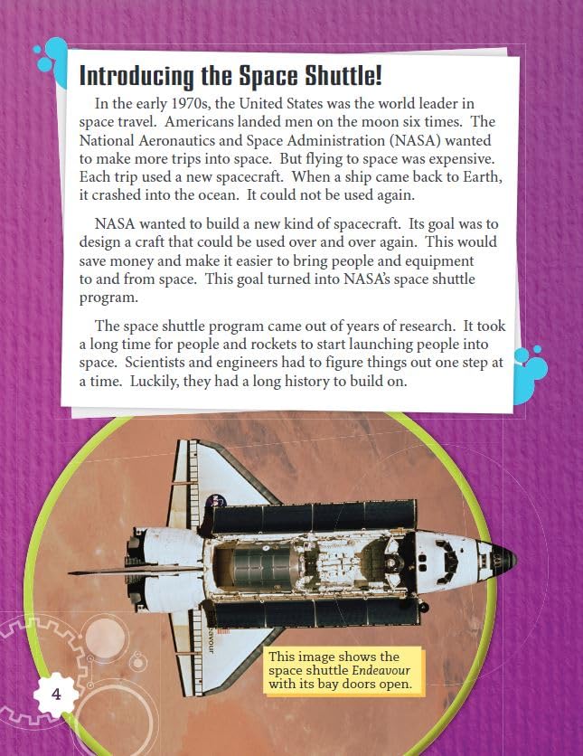Learn about the challenges NASA Engineers and scientists faced when tasked with creating the first space shuttle! this high-interest book uses real-world examples to teach how the engineering design process is used to solve problems.