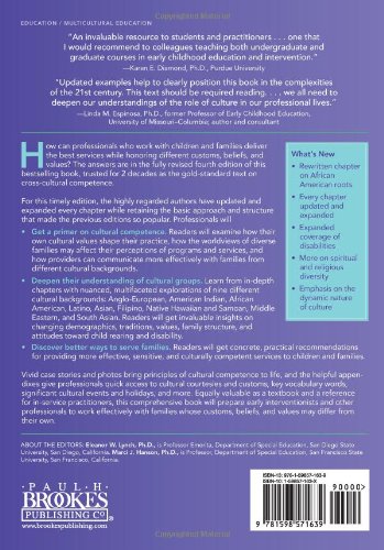 As the U.S. population grows more and more diverse, how can professionals who work with young children and families deliver the best services while honoring different customs, beliefs, and values? The answers are in the fourth edition of this bestselling textbook, fully revised to reflect nearly a decade of population changes and best practices in culturally competent service delivery. The gold-standard text on cross-cultural competence, this book has been widely adopted by college faculty and trusted as a reference by in-service practitioners for almost 20 years. For this timely NEW edition, the highly regarded authors have carefully updated and expanded every chapter while retaining the basic approach and structure that made the previous editions so popular. Professionals will Get a primer on cultural competence. Readers will examine how their own cultural values and beliefs shape their professional practice, how the worldviews of diverse families may affect their perceptions of programs and services, and how providers can communicate more effectively with families from different cultural backgrounds. Deepen their understanding of cultural groups. Learn from in-depth chapters with nuanced, multifaceted explorations of nine different cultural backgrounds: Anglo-European, American Indian, African American, Latino, Asian, Filipino, Native Hawaiian and Samoan, Middle Eastern, and South Asian. Readers will get up-to-date insights on history, demographics, traditions, values, and family structure, and they’ll examine the diverse ways each culture approaches child rearing, medical care, education, and disability. Discover better ways to serve families. Readers will get concrete recommendations for providing more effective, sensitive, and culturally competent services to children and families. They’ll find practical guidance for every step in the service delivery process, from initiating contact with families to implementing and evaluating services. Vivid case stories and photos bring the principles of cultural competence to life, and the helpful appendixes give professionals quick access to cultural courtesies and customs, key vocabulary words, significant cultural events and holidays, and more. Plus an expanded list of resources points readers to books, films, theater, and other media that will enhance their understanding of other cultures. New to this edition is a revised chapter on African American roots; thoroughly updated and expanded chapters; expanded coverage of disabilities; more on spiritual and religious diversity; and strategies for helping families make decisions about language use (English-only vs. preservation of native language). Equally valuable as a textbook and a reference for practicing professionals, this comprehensive book will prepare early interventionists and other professionals to work effectively with families whose customs, beliefs, and values may differ from their own.