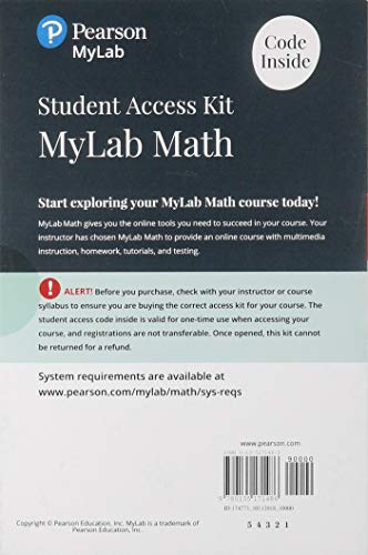 MyLab Math Standalone Access Card to accompany Martin-Gay, Developmental Mathematics, 4e This item is an access card for MyLabTM Math. This physical access card includes an access code for your MyLab Math course. In order to access the online course you will also need a Course ID, provided by your instructor. This title-specific access card provides access to the Martin-Gay, Developmental Mathematics, 4e accompanying MyLab course ONLY. 0135171482 / 9780135171486 MYLAB MATH WITH PEARSON ETEXT — STANDALONE ACCESS CARD — FOR DEVELOPMENTAL MATH, 4/e MyLab Math is the world’s leading online tutorial, and assessment program designed to help you learn and succeed in your mathematics course. MyLab Math online courses are created to accompany one of Pearson’s best-selling math textbooks. Every MyLab Math course includes a complete, interactive eText. Learn more about MyLab Math. ALERT: Before you purchase, check with your instructor or review your course syllabus to ensure that you select the correct ISBN. Used or rental books If you rent or purchase a used book with an access code, the access code may have been redeemed previously and you may have to purchase a new access code. Access codes Access codes that are purchased from sellers other than Pearson carry a higher risk of being either the wrong ISBN or a previously redeemed code. Check with the seller prior to purchase.