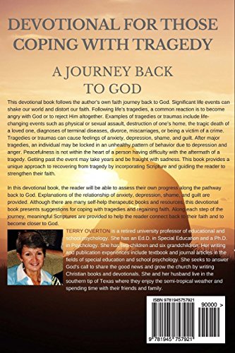 This devotional book follows the author’s own faith journey back to God. Significant life events can shake our world and distort our faith. Following life’s tragedies, a common reaction is to become angry with God or to reject Him altogether. Examples of tragedies or traumas include life-changing events such as physical or sexual assault, destruction of one’s home, the tragic death of a loved one, diagnoses of terminal diseases, divorce, miscarriages, or being a victim of a crime. Tragedies or traumas can cause feelings of anxiety, depression, shame, and guilt. After major tragedies, an individual may be locked in an unhealthy pattern of behavior due to depression and anger. Peacefulness is not within the heart of a person having difficulty with the aftermath of a tragedy. Getting past the event may take years and be fraught with sadness. This book provides a unique approach to recovering from tragedy by incorporating Scripture and guiding the reader to strengthen their faith. In this devotional book, the reader will be able to assess their own progress along the pathway back to God. Explanations of the relationship of anxiety, depression, shame, and guilt are provided. Although there are many self-help therapeutic books and resources, this devotional book presents suggestions for coping with tragedies and regaining faith. Along each step of the journey, meaningful Scriptures are provided to help the reader connect back to their faith and to become closer to God.