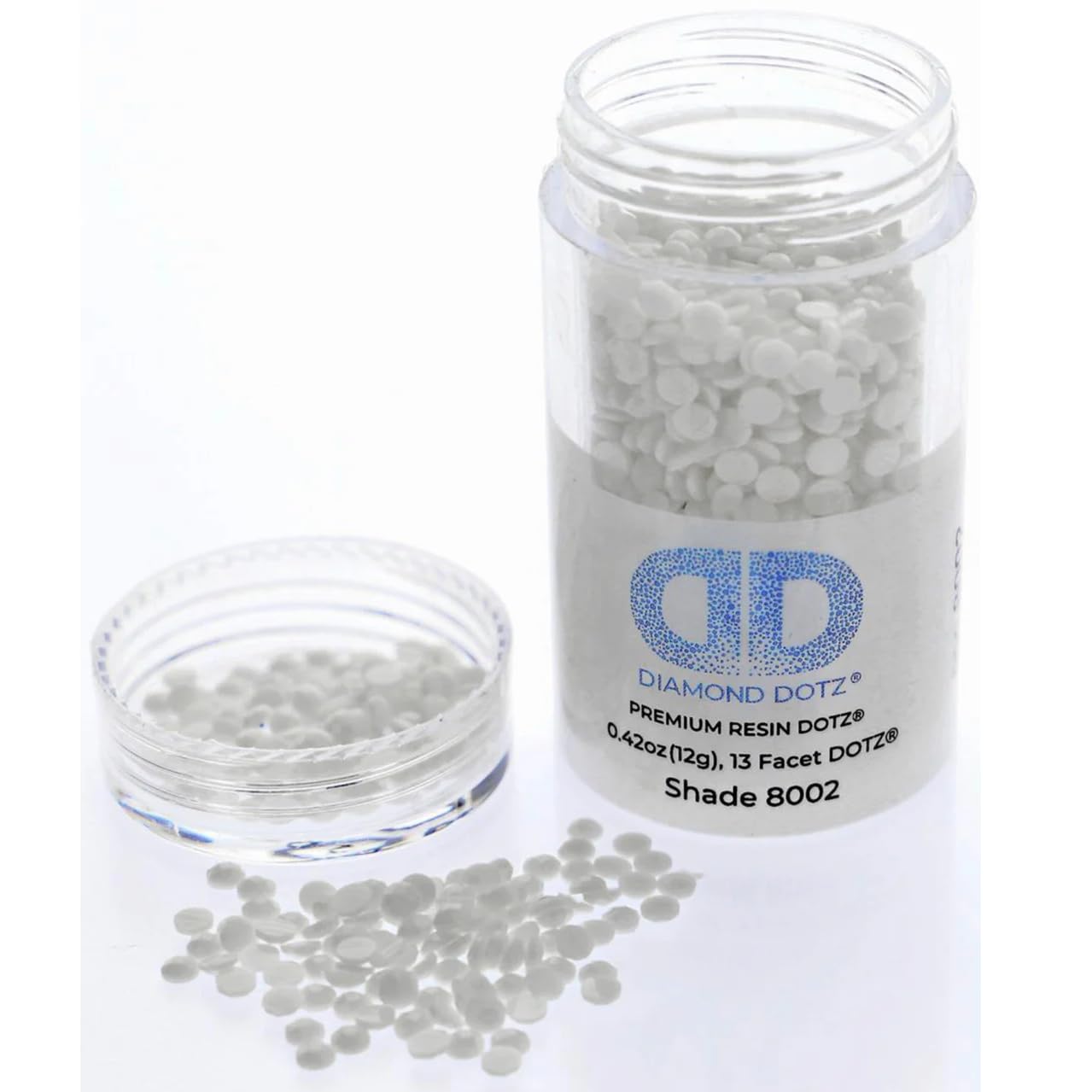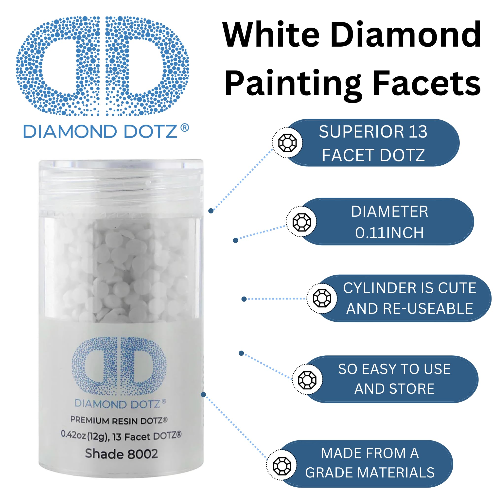 Diamond Dotz Freestyle Gems produce a stunning shimmery effect. Scratch resistant resin dot gems have 13 facets for a diamond like effect. The flat back makes attachment easy. Use a durable glue like, DDFDDA. 060 Diamond Dotz Freestyle Adhesive, sold separately. 2. 8mm 12g White