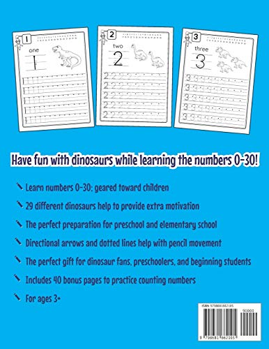 Prepare your child for school! This dinosaur-themed number workbook will get your child excited while helping to develop his/her spatial imagination. Have fun with dinosaurs while learning the numbers 0-30! Are you looking for an age-appropriate workbook to teach your child numbers–one that makes it fun? This dinosaur workbook is the perfect choice! Your little one will not only learn how to write numbers but also will enjoy coloring amazing prehistoric dinosaurs. This preparatory book helps to prepare your child for elementary school. Not overly challenging, it provides age-appropriate help in learning numbers. To help maximize success in learning, each number starts with directional arrows and dotted lines to help your child easily trace and connect. And there is plenty of space to practice the writing movements they learn. This number workbook is a wonderful gift idea for any child who will be starting school. Details at a glance: Learn numbers 0-30; geared toward children 29 different dinosaurs help to provide extra motivation The perfect preparation for preschool and elementary school Directional arrows and dotted lines help with pencil movement The perfect gift for dinosaur fans, preschoolers, and beginning students Includes 40 bonus pages to practice writing numbers For ages 3+ Scroll up, and click “Buy now” to bring the world of numbers to your child in a fun and playful way!