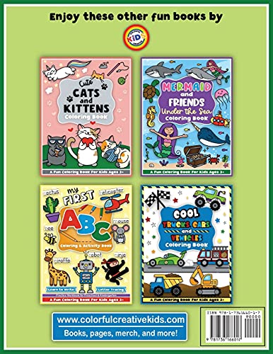Visit our store Amazon.com/colorfulcreativekids for other books, apparel, and more! This Dinosaur and Dragon Coloring and Workbook brings prehistoric dinosaurs and magical dragons to life for you and your little one to have fun coloring! Designed for Preschool Boys and Girls Toddlers and Kids Ages 3-5, but truly fun for anyone! 100% Original drawings All of Colorful Creative Kids’ content is entirely hand-drawn, colored, animated, and published by our artist, who is a Mom and knows what kids like! 25 Coloring Pages In this book, you will find 25 high-quality coloring pages with sharp, thick lines that are easy and fun to color! One design per page The heavy grade single-sided pages prevent bleed through, and also permit the page to be removed and framed! With one-sided printed, you do not have to worry about which side to put on display! Hang up those masterpieces! Hours of coloring fun With so many pages to color, this Dinosaur and Dragon Coloring and Workbook offers hours of prehistoric and magical fun!