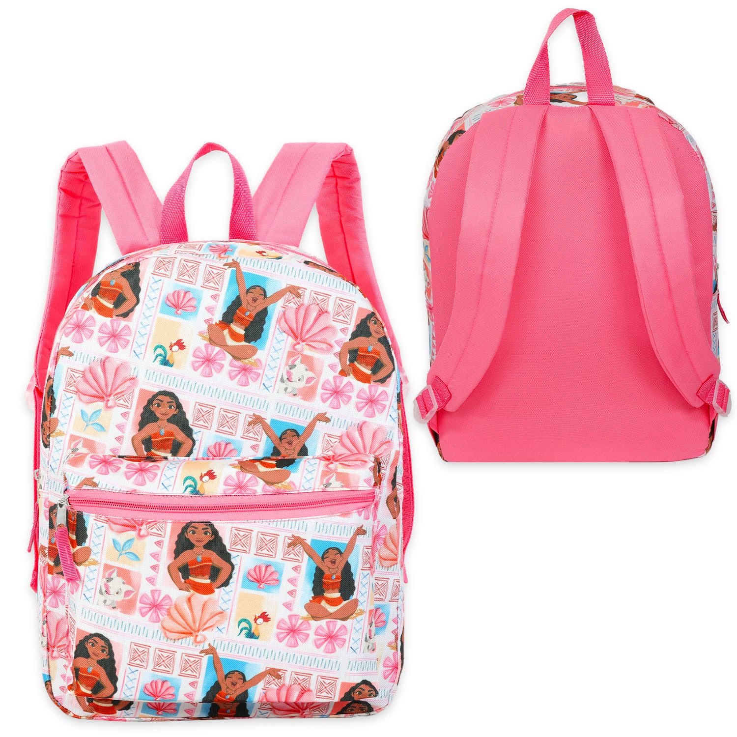 - This Moana backpack set includes a 16″ Moana backpack with adjustable shoulder straps, zip closure compartment, and top loop for hanging featuring artwork of Moana.