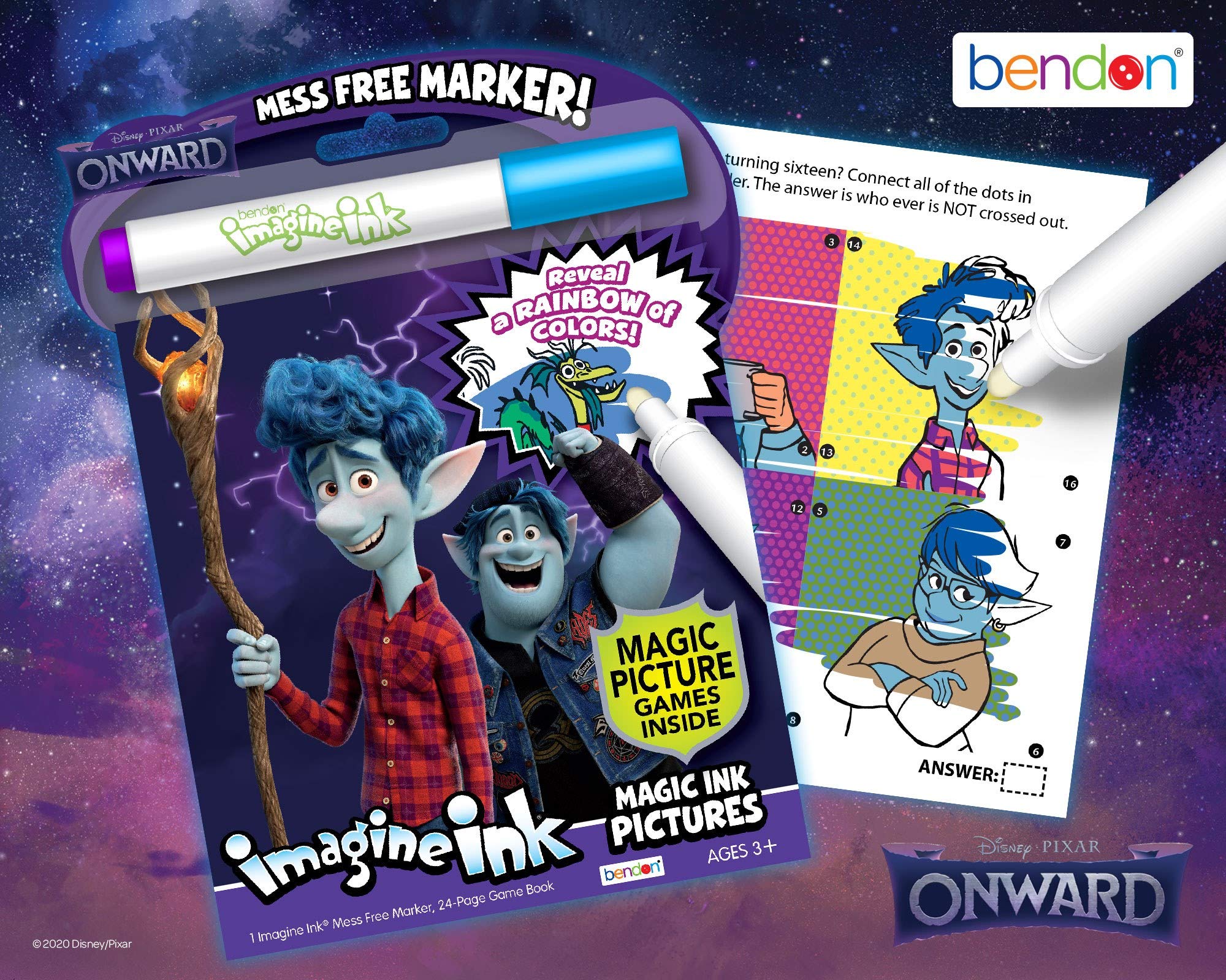 Watch a rainbow of colors appear like magic with Bendon’s Onward Imagine Ink Magic Ink Pictures! Artists of all skill levels will love finding favorite characters, and their friends hidden across 24 magic reveal pages. Its compact design makes it perfect for travel, too! Includes 1 Mess Free Imagine Ink Marker. This is designed to be used with the included Imagine Ink Marker – a clear, non-toxic marker that will not visibly mark most other items! This is an official Disney product, accept no substitutions! Ideal for children ages 3 and up.
