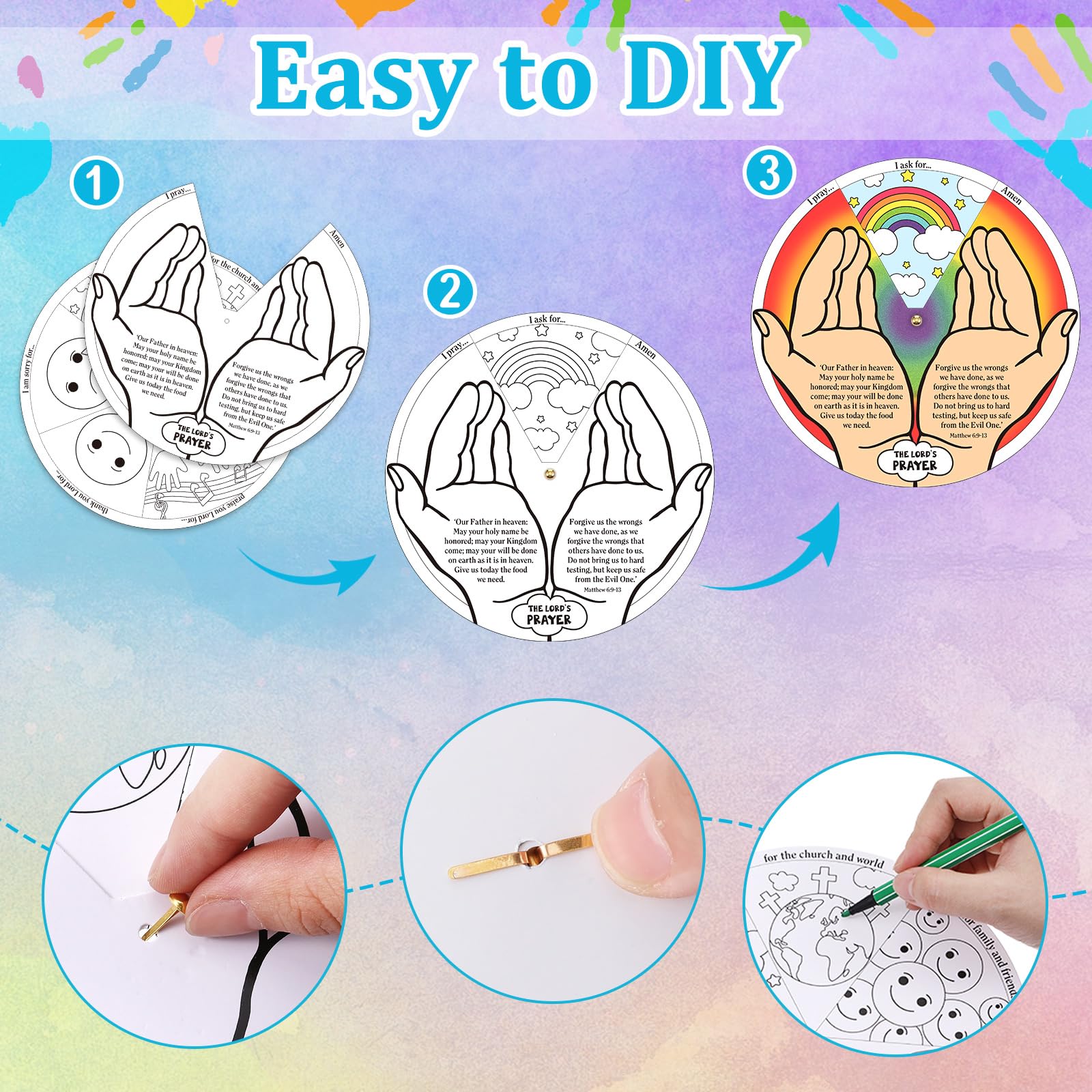 - What You Get: 24 sets of the The Lord’s prayer coloring crafts (48 sheets in total, 8″ in diameter), and 24 pcs of metal brads; Please note: to reduce plastic packaging, these religious wheel craft kit pieces aren’t pre-packaged for individual apply, please do consider this before purchasing