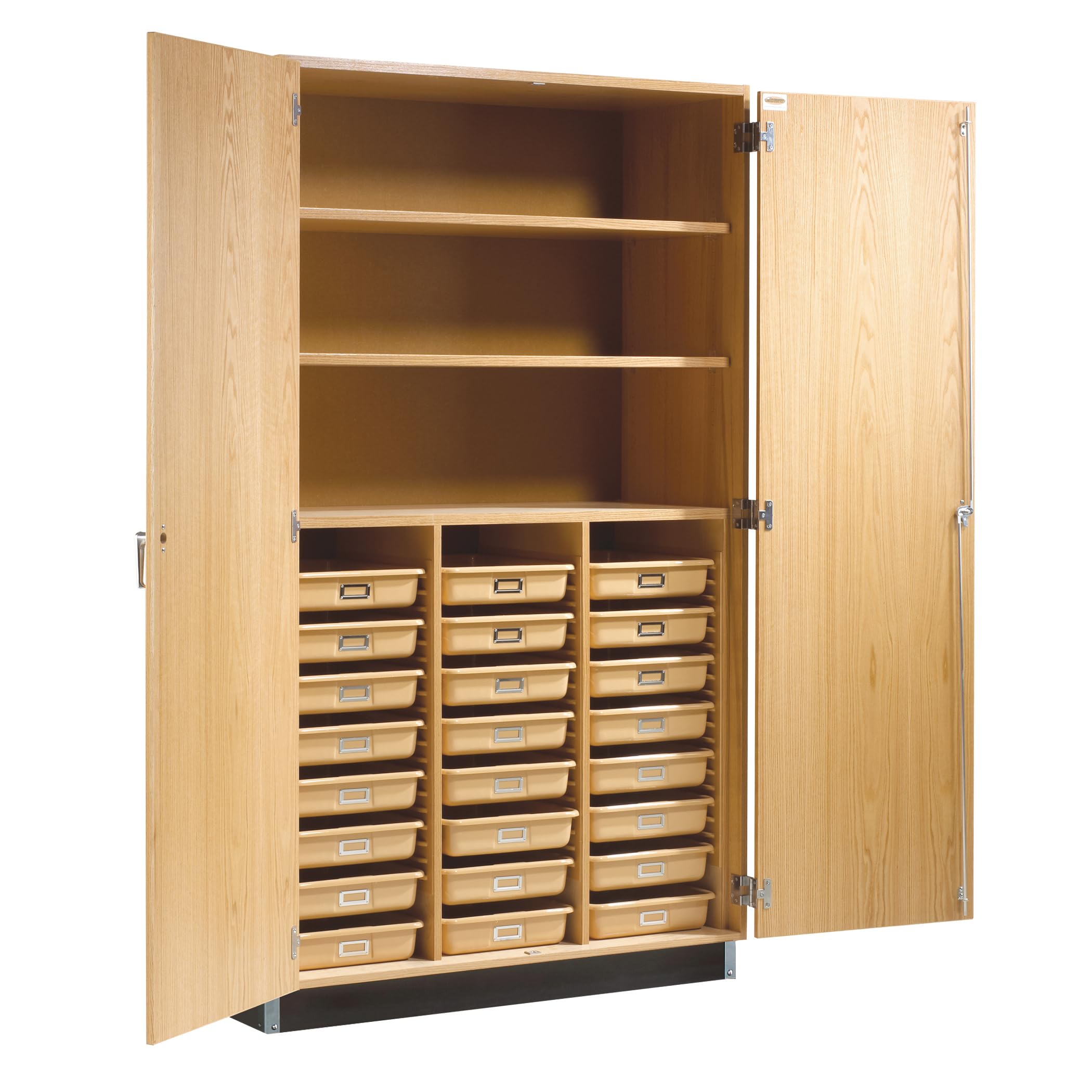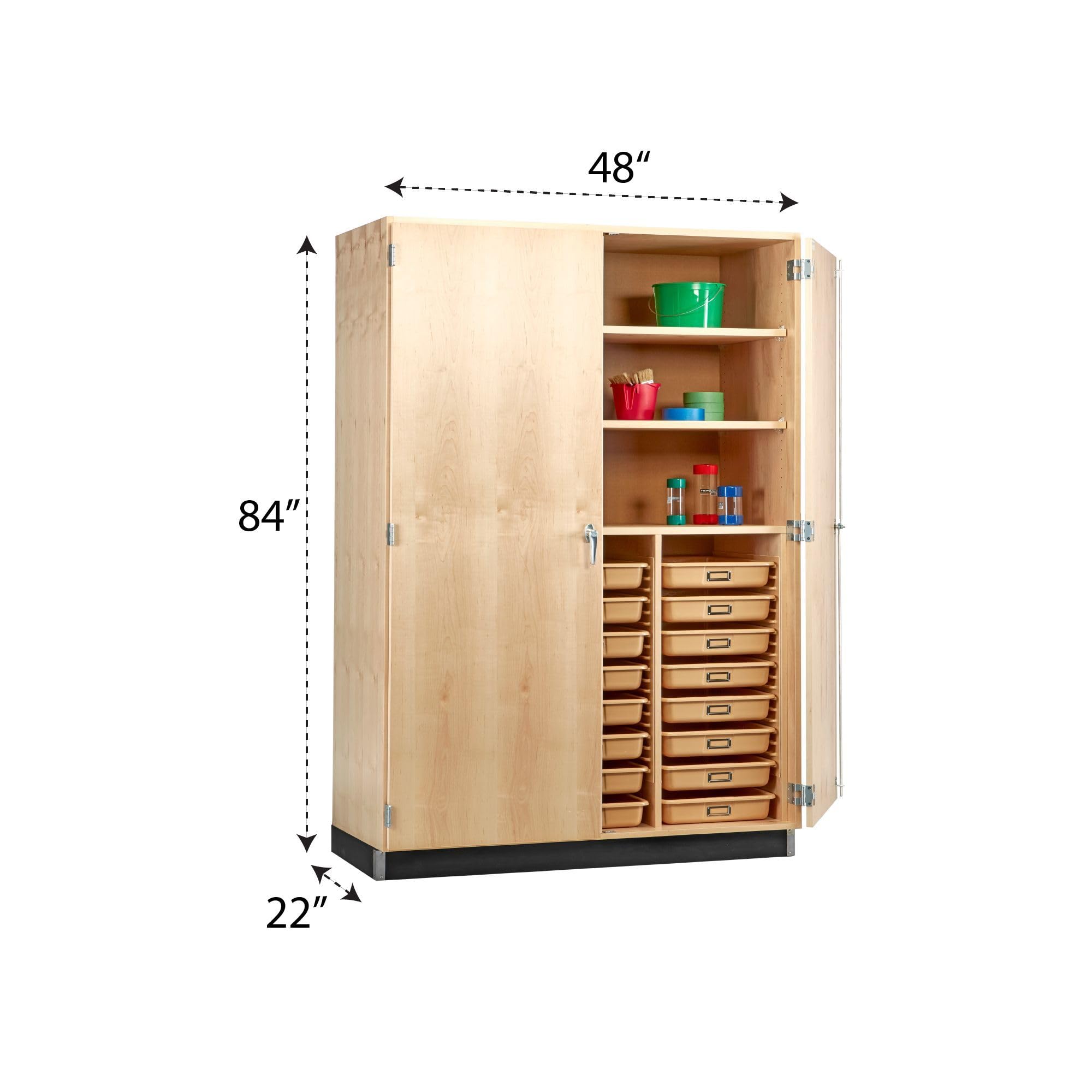 Access Tote Tray & Shelf Storage Cabinet – Features: 2 adjustable and one fixed shelf. 24 trays included that measure 19″D x 14-1/4″ W x 3-1/2″ H. Cabinet is 48″W x 22″D x 84″H and constructed of solid Maple and Maple veneers. Diversified Woodcrafts Inc. is SEFA compliant and MAS Certified Green. Features include two hinged Maple doors with three-point locking handles. Limited Lifetime Warranty. Made in the U.S.A. The unit is finished with a chemical resistant, earth-friendly UV finish and rubber base molding. This storage cabinet holds 24 tote trays