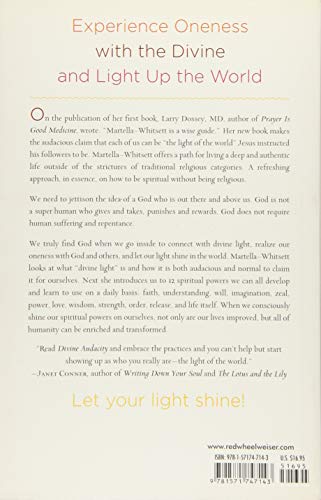 Experience Oneness with the Divine and Light Up the World On the publication of her first book, Larry Dossey, MD, author of Prayer Is Good Medicine, wrote: “Martella-Whitsett is a wise guide.” Her new book makes the audacious claim that each of us can be “the light of the world” Jesus instructed his followers to be. Martella-Whitsett offers a path for living a deep and authentic life outside of the strictures of traditional religious categories. A refreshing approach, in essence, on how to be spiritual without being religious. We need to jettison the idea of a God who is out there and above us. God is not a super-human who gives and takes, punishes and rewards. God does not require human suffering and repentance. We truly find God when we go inside to connect with divine light, realize our oneness with God and others, and let our light shine in the world. Martella-Whittset looks at what “divine light” is and how it is both audacious and normal to claim it for ourselves. Next she introduces us to 12 spiritual powers we can all develop and learn to use on a daily basis: faith, understanding, will, imagination, zeal power, love, wisdom, strength, order, release, and life itself. When we consciously shine our spiritual powers on ourselves, not only are our lives improved, but all of humanity can be enriched and transformed. Let your light shine!