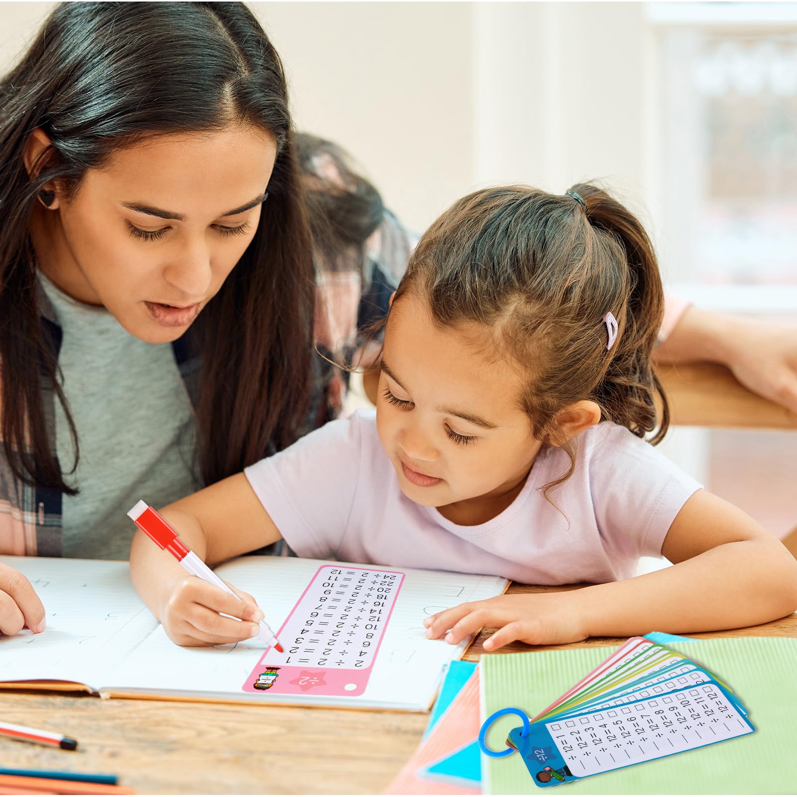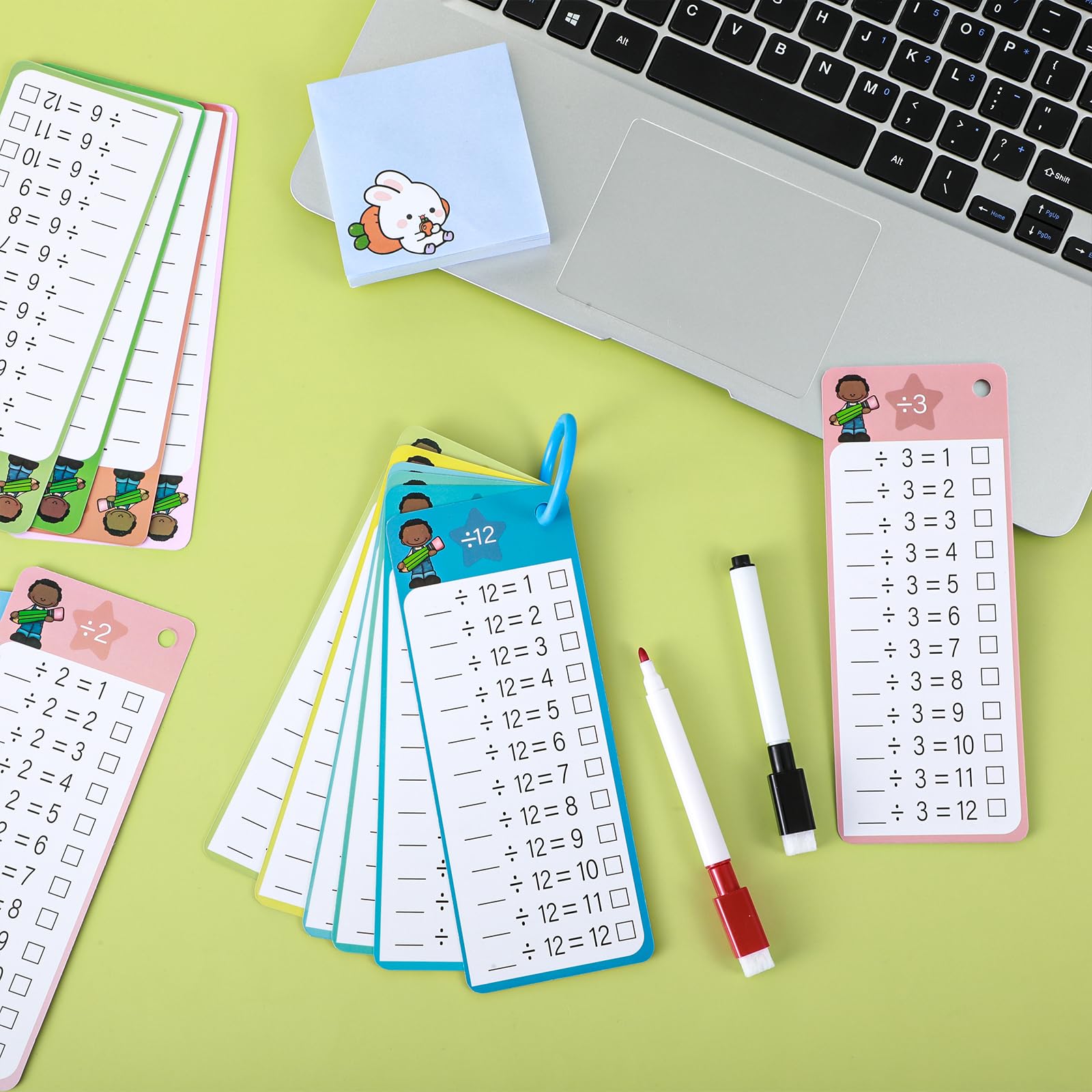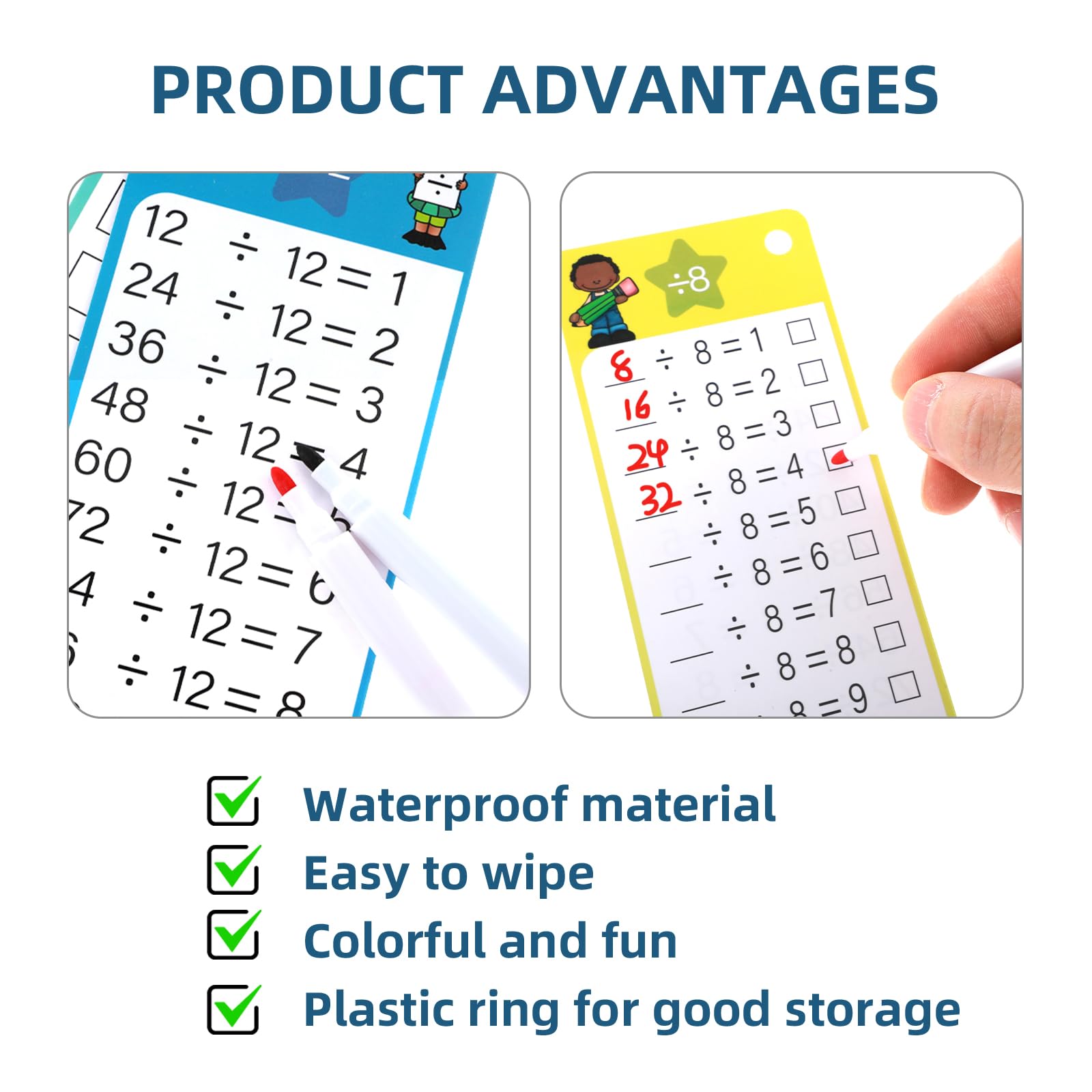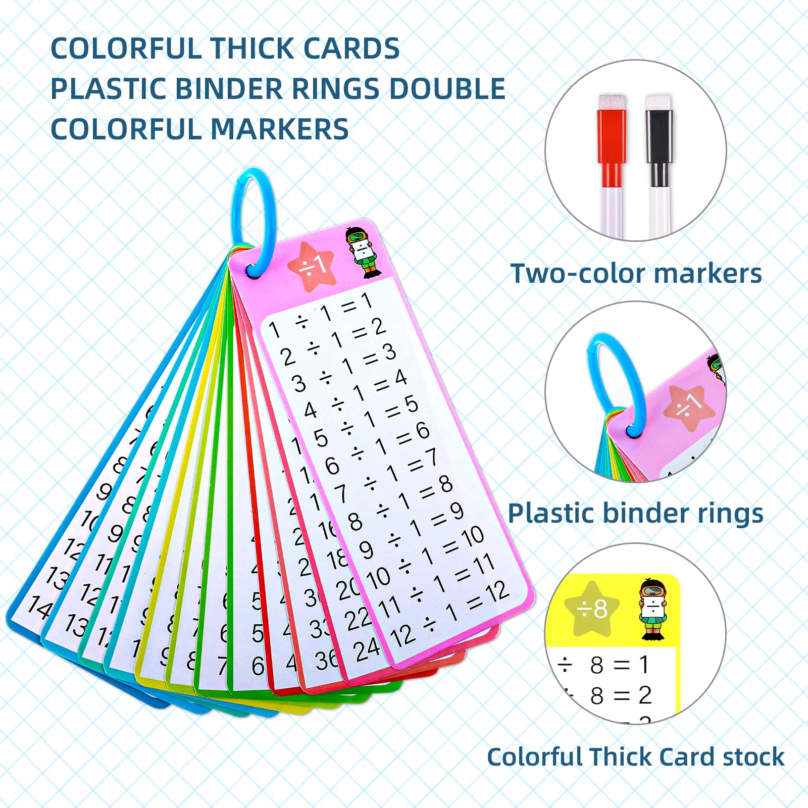 - Easy to Use: These division flashcards have questions on one side and answers on the other side, and the two color dry erase pen is convenient for checking answers.