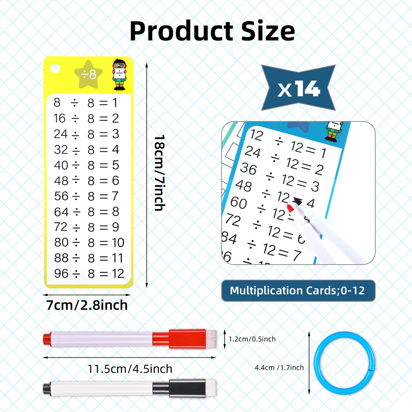 Quality Service Your satisfaction is our greatest concern. If you have any questions or dissatisfaction with the product, please feel free to contact us and we will provide you with the best solution. Specification Product name: division flash cards Color: Cards: colorful / Pens: black, red / Storage ring: blue Material: Paper / Plastic Size: Card size 7x18cm / 2.8x7inch smooth rounded corners + punched holes Pen size 11.5×1.2x1cm / 4.5×0.5×0.4inch Storage ring diameter 4.4cm / 1.7inch Net weight: 61g Gross weight: 61g Packing method: bagged Packing size: 19*11*1.9cm Packing List 13 division flash cards 2 red black dry erase pens 1 storage key ring