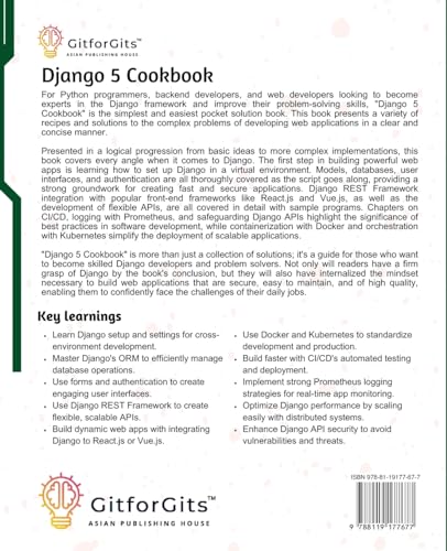 For Python programmers, backend developers, and web developers looking to become experts in the Django framework and improve their problem-solving skills, “Django 5 Cookbook” is the simplest and easiest pocket solution book. This book presents a variety of recipes and solutions to the complex problems of developing web applications in a clear and concise manner. Presented in a logical progression from basic ideas to more complex implementations, this book covers every angle when it comes to Django. The first step in building powerful web apps is learning how to set up Django in a virtual environment. Models, databases, user interfaces, and authentication are all thoroughly covered as the script goes along, providing a strong groundwork for creating fast and secure applications. Django REST Framework integration with popular front-end frameworks like React.js and Vue.js, as well as the development of flexible APIs, are all covered in detail with sample programs. Chapters on CI/CD, logging with Prometheus, and safeguarding Django APIs highlight the significance of best practices in software development, while containerization with Docker and orchestration with Kubernetes simplify the deployment of scalable applications. “Django 5 Cookbook” is more than just a collection of solutions; it’s a guide for those who want to become skilled Django developers and problem solvers. Not only will readers have a firm grasp of Django by the book’s conclusion, but they will also have internalized the mindset necessary to build web applications that are secure, easy to maintain, and of high quality, enabling them to confidently face the challenges of their daily jobs. Key Learnings Learn Django setup and settings for cross-environment development. Master Django’s ORM to efficiently manage database operations. Use forms and authentication to create engaging user interfaces. Use Django REST Framework to create flexible, scalable APIs. Build dynamic web apps with integrating Django to React.js or Vue.js. Use Docker and Kubernetes to standardize development and production. Build faster with CI/CD’s automated testing and deployment. Implement strong Prometheus logging strategies for real-time application monitoring and troubleshooting. Optimize Django performance by scaling easily with distributed systems. Enhance Django API security to avoid vulnerabilities and threats. Table of Content Up and Running with Django Deep Dive into Models and Databases Mastering Django’s URL Dispatcher and Views Templates, Static Files, and Media Management Forms and User Interaction Authentication and Authorization Django REST Framework for APIs Testing, Security, and Deployment Advanced Web Application Features with Django Django and Ecosystem