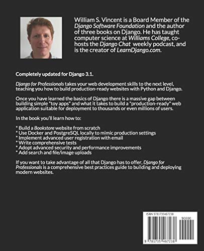 Completely updated for Django 4.0! Django for Professionals takes your web development skills to the next level, teaching you how to build production-ready websites with Python and Django. Once you have learned the basics of Django there is a massive gap between building simple “toy apps” and what it takes to build a “production-ready” web application suitable for deployment to thousands or even millions of users. In the book you’ll learn how to: Build a Bookstore website from scratch Use Docker and PostgreSQL locally to mimic production settings Implement advanced user registration with email Customize permissions to control user access Write comprehensive tests Adopt advanced security and performance improvements Add search and file/image uploads Deploy with confidence If you want to take advantage of all that Django has to offer, Django for Professionals is a comprehensive best practices guide to building and deploying modern websites. Reviews “When readers interested in web development ask me what to read next after Python Crash Course, I refer them to Will’s books: Django for Beginners, Django for APIs, and Django for Professionals. I highly recommend you check out his work.”–ERIC MATTHES, author of Python Crash Course “If you’re looking for a guide into the world of Django, then the three-step of Django for Beginners, Django for APIs, and Django for Professionals is ideal: get up and running, get into APIs, which are a cornerstone of modern app development, and then add the bits you need to your fledging app into production, from databases and static files, to user accounts and security. It’s a long road. Will’s books are an awesome companion.”–CARLTON GIBSON, Django Fellow and Django REST Framework core contributor “A fantastic resource for web development with Django and Python. I highly recommended them”–JEFF TRIPLETT, Python Software Foundation Director, DEFNA President, and REVSYS Partner “Django for Beginners is my go-to recommendation whenever anyone asks how to learn Django. It starts with a friendly and patient approach but manages to cover all the core fundamentals, dives into deployment, and has extensive coverage of testing. If you are looking for one book to master Django, this is it!”–ANNA MAKARUDZE, former President of the Django Software Foundation “A fantastic on-ramp to this brilliant web framework. Django for Beginners doesn’t just talk about building sites with Django, it walks you through five of them. Get in the reps!”–ADAM JOHNSON, Django Project Steering Council member and author of two intermediate Django books “Choosing a book for your Django learning journey is a big commitment of your time and energy. That’s why it matters who the author is and the intended audience. I’ve known Will for many years and he’s deeply embedded in the Django community. He is a former Board Member of the Django Software Foundation and cohost of the 5-years running DjangoChat podcast. This means he’s thought a lot about how people learn and use Django. That goes way beyond just reading the docs and doing a tutorial.” –MICHAEL KENNEDY, host of Talk Python and Python Bytes podcasts, founder of Talk Python Training