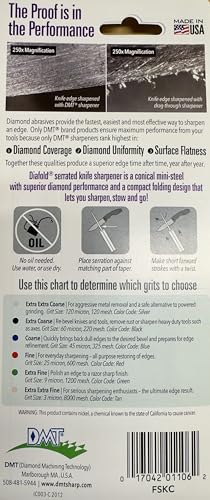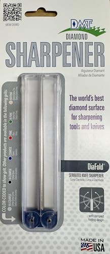 Product Description DMT FSKC Diafold Serrated Knife Sharpener From the Manufacturer One tool for many tasks–an excellent value for home, shop and recreational use. The Diafold Serrated Knife Sharpener not only maintains serrated edges, but also serves as a mini-steel, gut hook sharpener and conical file. Size: 1/4″ to 1/16″ taper. Coarse diamond (45 micron / 325 mesh) quickly restores a neglected edge. Convenient size: 9 1/2″ open. 5″ closed. Folding plastic handles protect sharpener when not in use. Sharpens in a fraction of the time required by conventional stones. No messy oils needed–sharpen dry or with water. Durable construction will provide years of consistent performance and reliable service For proper tool maintenance, woodworkers, chefs and other professionals rely on the superior quality and versatility of DMT products. Made in USA.