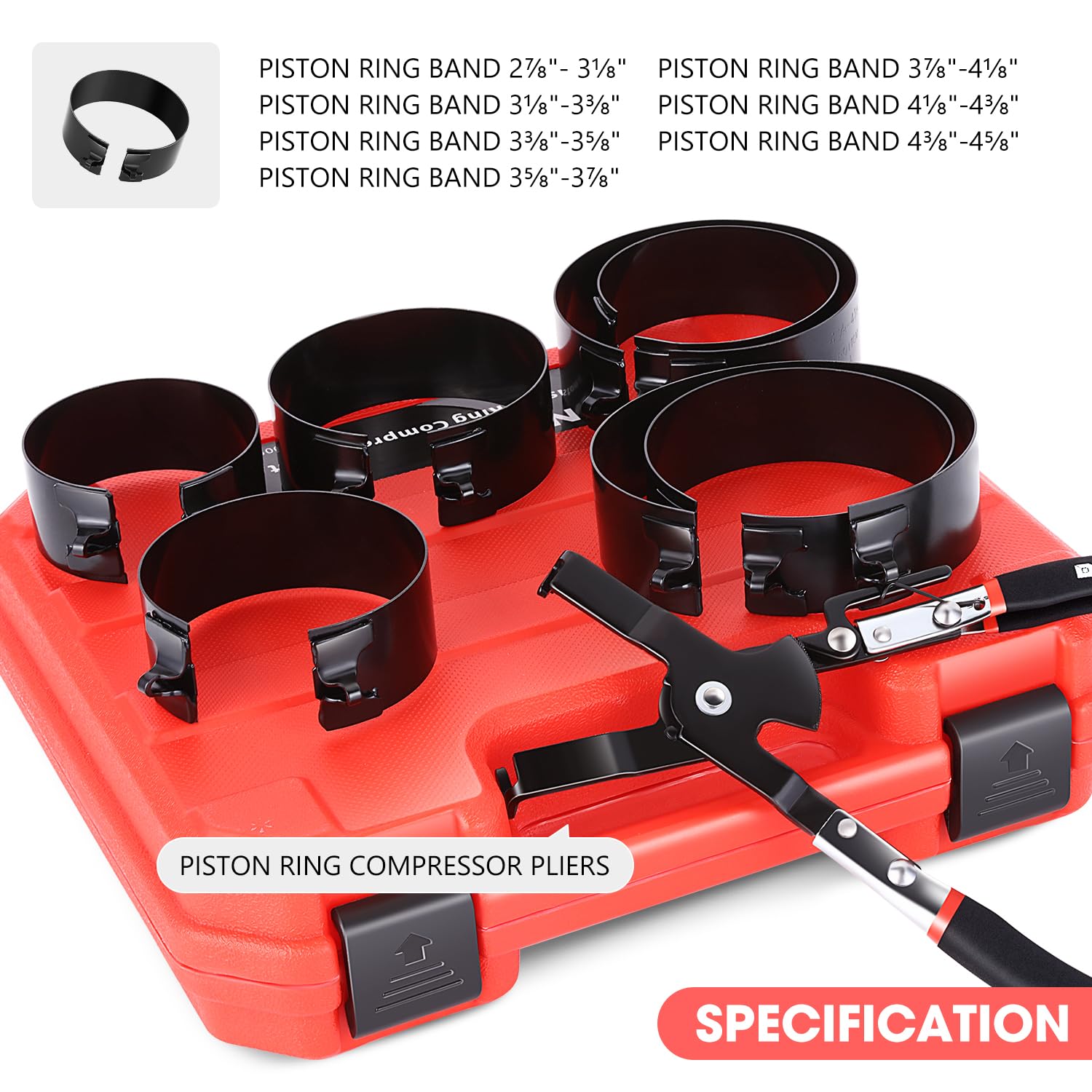 • [(Versatile Design)] This Set Features A Heavy-duty Ratcheting Compression Pliers And Six Piston Ring Compressors, Each Labeled For Easy Identification And Compatible With Various Piston Sizes.