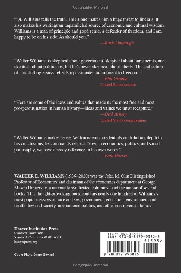 Walter E. Williams (1936-2020) was the John M. Olin Distinguished Professor of Economics and chairman of the economics department at George Mason University, a nationally syndicated columnist, and the author of several books. This thought-provoking book contains nearly one hundred of Williams’s most popular essays on race and sex, government, education, environment and health, law and society, international politics, and other controversial topics.