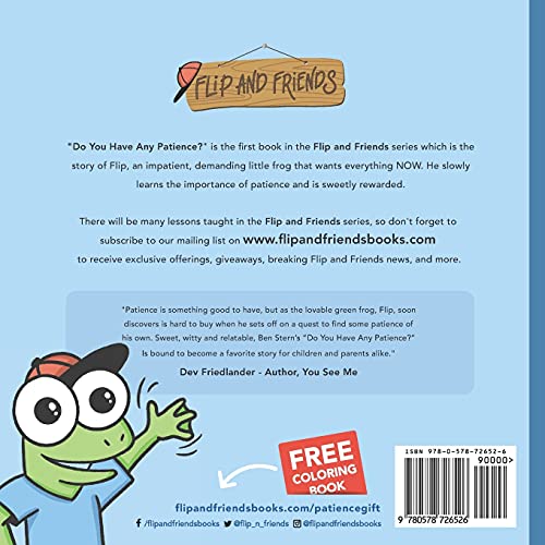 “Do You Have Any Patience?” is the first book in the Flip and Friends book series which is the story of Flip, an impatient, demanding little frog that wants everything NOW. He slowly learns the importance of patience and is sweetly rewarded. Parents, with this book, you will be able to clearly teach your child the importance of patience without the need for a lecture or punishment. We recently launched ThePatienceBook.com in response to parents, teachers, and grandparents reaching out to us asking what else they can do to reinforce the lesson of patience. On ThePatienceBook.com, you will find videos for children and adults, activities, resources, and more. Coloring Book, Activity Book, and multiple languages at ThePatienceBook.com/book BE THE FIRST TO KNOW Sign up for our mailing list at FlipandFriendsBooks.com and receive a FREE Flip and Friends coloring book based on the “Do You Have Any Patience?” story! We are hard at work on the next book in the Flip and Friends series, and we are excited to offer you exclusive offerings, giveaways, Flip and Friends news, and more. Here are what the professionals are saying: “Patience is something good to have, but as the lovable green frog, Flip, soon discovers is hard to buy when he sets off on a quest to find some patience of his own. Sweet, witty and relatable, Ben Stern’s “Do You Have Any Patience?” Is bound to become a favorite story for children and parents alike. ” – Dev Friedlander – Author, You See Me “Flip and Friends is a bright, colorful book that is sure to appeal to kids. The characters are cute, loveable, and carry a message for parents and children alike. Ben Stern has found a way to turn an important life-long lesson, into an easy read for even the little ones!” – Yona Margolese – Head of School, Seattle, Washington “The story of Flip and his trek to purchase patience is a story that children of all ages and in all countries deal with daily. So often, it is not material items that we strive to attain for our children, but the deep social understandings of our world. This impactful social story allows children to visualize the reward received for obtaining the characteristic of patience, and the value it has towards the upbringing of our children. Ben so masterfully created a tale in which this important lesson can be visualized and understood by all children.” – Dan Seid, Principal, Rockville Centre NY
