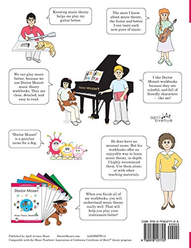Sample pages for this workbook can be viewed here: DoctorMozart.com/LookInside.php If you need the answer book, search for Doctor Mozart Answers Level 1 How This Workbook Can Help: Ideal for young beginners, the three Doctor Mozart Level 1 workbooks cover the following topics in depth: Level 1A Topics The treble and bass clefs. Match staff notes with keys on the keyboard. The C major triad. Quarter, half, and whole notes. Bar lines and measures. Time signatures. Level 1B Topics All notes on the treble and bass staffs. Draw lines from staff notes to the keyboard. Quarter, half, and whole notes and rests. Time signatures. Dynamics and articulation marks. Level 1C Topics Accidentals, diatonic and chromatic semitones, enharmonic notes, key signatures, scales. Tempo and expression terminology. A colorful certificate of achievement at the end of each book rewards students for their effort. After completing the Level 1 workbooks, your child can progress to the more advanced Level 2 and 3 workbooks, for success with music at an intermediate level. If your child is 8 years or older, you might find the Doctor Mozart Older Beginners workbook more suitable than Levels 1A and 1B. ( ISBN 9780988168817 ) Help Your Child Succeed with Music Music theory knowledge is essential for your child’s success. Doctor Mozart workbooks use the piano keyboard and colorful illustrations to explain basic music theory concepts. This will help your child succeed with any musical instrument, including piano, guitar, flute, violin, and voice. Doctor Mozart workbooks offer: Entertaining, colorful illustrations, which serve as memory aids. Clear, detailed explanations in short, simple sentences. Highly effective exercises to ensure that your child understands every topic. Experience with writing notes, clefs, and musical symbols by hand, for learning that is deep and enduring. Free videos on the DoctorMozart.com website to help your child get started with music theory. Ideal For Music Lessons and Home Schooling Because each topic is explained clearly and in detail, Doctor Mozart workbooks are easy to understand for children and parents alike. Hence they are ideal for home schooling. As well, Doctor Mozart workbooks are exceptionally helpful with formal music lessons, no matter what other teaching materials are used. They are also compatible with the Royal Conservatory of Music(r) Basic Rudiments program and the Music Teachers’ Association of California Certificate of Merit(r). Music Teachers Reviews “I have several of my 4 and 5 year olds using the Doctor Mozart Book. They are enjoying it immensely.” D.L., AB. “Our Kindergarten and 1st graders especially love this book. I’m really impressed with how much they enjoy doing their theory work. If anything is going to get done during the week, it is their pages in Doctor Mozart.” L.H., LA “I have been searching for a theory book which will enhance the piano student’s lessons rather than bore them. The Doctor Mozart theory book is filled with everything for which I have been searching. The pages are colorful, and there are interesting, fun tips that help students retain information in ways not found in the traditional theory books.” J.K., Maple Grove, MN The Doctor Mozart theory workbooks include levels 1A, 1B, 1C, 2A, 2B, 2C, 3, Older Beginners, and 2 answer books.
