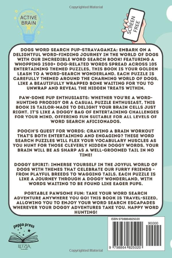 Embrace the canine charm! Join me on an adventure through the enchanting world of ‘Dogs Word Search’ – a book that’s like stepping into a tail-wagging wonderland! Imagine this: 2500+ CANINE WORDS hidden within 105 themed puzzles, just waiting for you to uncover their secrets. It’s like discovering a treasure map leading straight to the heart of doggone fun! Each puzzle is a mini dog biscuit, ready to be turned over and reveal the hidden treasures tucked within its twists and turns. Picture the excitement of finding those secret words – it’s akin to discovering a hidden treat in your dog’s favorite hiding spot! But wait, it’s not just for the young or the seasoned pros – this puzzle book is a gathering place for spirited dog lovers and seasoned puzzle enthusiasts alike. It’s a bit like a cozy dog bed, warming up your brain cells just right. There’s a sprinkle of magic and a dash of canine charm, making it a potion that suits every word sleuth out there. Prepare for a brain workout that’ll make your mind as agile as a playful pup in the park! These word search puzzles are more exhilarating than a game of fetch in the dog park. They’ll have you flexing your vocabulary muscles as you hunt for those cleverly hidden words. Before you know it, your brain will be sharper than a dog’s keen sense of smell! Feeling those canine vibes yet? Dive headfirst into themes that celebrate the magic of our furry friends – from playful puppies to loyal companions. Each puzzle is like a journey through a pup-filled park, where you’ll stumble upon words that are like doggy delights waiting to be discovered. It’s like embarking on a doggy quest with every page you turn! And guess what? You don’t need to be tied to your doghouse to enjoy this adventure. This book is portable, small enough to carry on your doggy escapades. It’s like having a pocket-sized treasure chest that lets you explore the wonders of dogs wherever your paws take you! There you have it, my friend – ‘Dogs Word Search’ is more than just a book. It’s a journey, a puzzle, and a paw-sitive experience all wrapped up in one. It’s like the joy of playing with your furry best friend or the comfort of a snuggle on a chilly evening. Grab your magnifying glass and let’s dive into this tail-wagging wonderland of word puzzles!