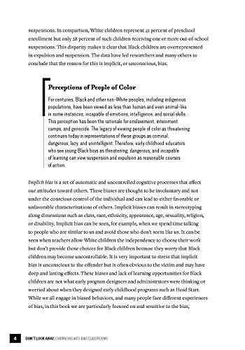 Every day, 250 children are suspended from school. Many are children of color, deprived of opportunities to experience learning at the same rate and quality as white children. Many families don’t feel heard or respected in their child’s schools. Don’t Look Away: Embracing Anti-Bias Classrooms leads early childhood professionals to explore and address issues of bias, equity, low expectations, and family engagement to ensure culturally responsive experiences. Importantly, this book will challenge you to consider your perceptions and thought processes.