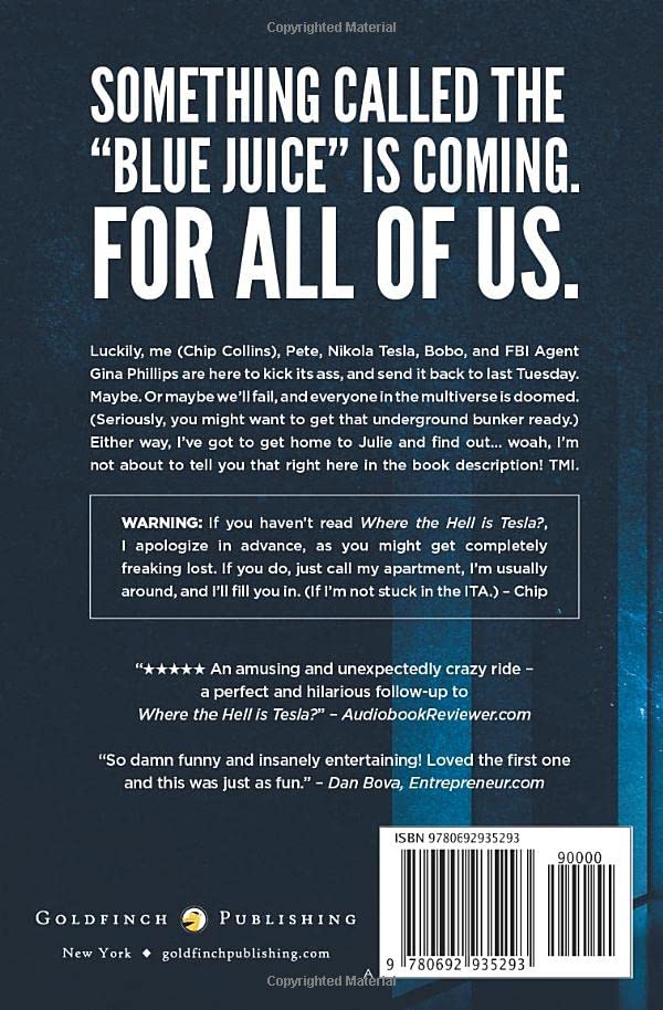 The sequel to Where the Hell is Tesla? is HERE!SOMETHING CALLED THE “BLUE JUICE” IS COMING. FOR ALL OF US. Luckily, me (Chip Collins), Pete, Nikola Tesla, Bobo, and FBI Agent Gina Phillips are here to kick its ass, and send it back to last Tuesday. Maybe. Or maybe we’ll fail, and everyone in the multiverse is doomed. (Seriously, you might want to get that underground bunker ready.) Either way, I’ve got to get home to Julie and find out… woah, I’m not about to tell you that right here in the book description! TMI.WARNING: If you haven’t read Where the Hell is Tesla?, I apologize in advance, as you might get completely freaking lost. If you do, just call my apartment, I’m usually around, and I’ll fill you in. (If I’m not stuck in the ITA.) – Chip