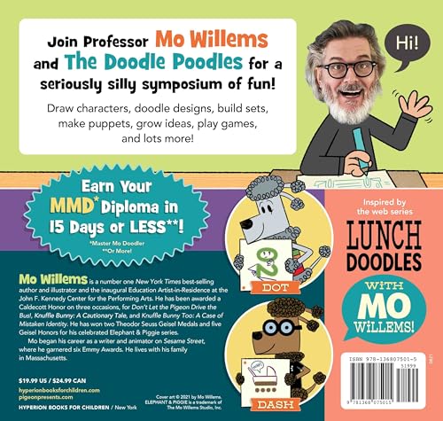 Doodlers earn their MMD (Master Mo Doodler) diploma in 15 days or less (or more!) with this activity-packed doodle book. Draw impossible buildings, animate favorite characters, design sets, make puppets, give gifts, and create abstract art with Mo Willems! This 144-page activity book builds on the 15-episode web series LUNCH DOODLES with Mo Willems! originally produced by Mo Willems with the Kennedy Center in March of 2020. Featuring new hosts Dot and Dash, the Doodle Poodles, kids get writing and drawing tips from Mo across 15 chapters of daily doodling fun. Bonus features include perforated gatefold SUPER BOUNCE! gameboards, pop-out finger puppets, and how-to-draw instructions of popular Mo Willems characters.