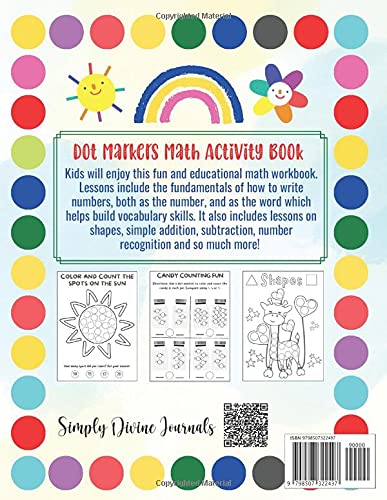 Kids will enjoy this fun and educational math workbook. Lessons include the fundamentals of how to write numbers, both as the number, and as the word which helps build vocabulary skills. It also includes lessons on shapes, simple addition, subtraction, number recognition and so much more! Benefits of Using Dot Markers: Hand-eye coordination Visual motor skills Fine motor skills Creative play