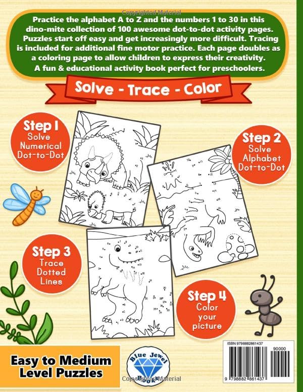 New Book! Special Launch Pricing Dot to Dot for Kids Age 3-5: Dinosaurs, Fossils, Prehistoric Creatures and More Enter a DINO-MITE prehistoric world with this fantastic collection of 100 dot to dot puzzles. These easy dot to dot puzzles gradually increase in difficulty up to 30 dots per page and will have your child counting in no time. Enjoy a great variety of engaging images with plenty of details for coloring in this fun, creative experience. Dot to Dots are great at improving eye-hand coordination and fine motor skills as well as teaching number recognition. Get hours of screen-free educational entertainment! Here’s why you and your child will love this book! Puzzles start at 5 dots and gradually increase in difficulty to 30 dots per page. Get number and alphabet dot to dots! Practice counting 1-30 and the uppercase alphabet both in one book! Full page pictures with large dots and numbers, perfect for young children. Fun dot-to-dots double as great coloring pages. Additional tracing opportunities are included for fine motor practice. Double-sided pages allow us to give you twice as many activities for the same cost. Great for parents, grandparents, or relatives to color with the kids. Perfectly matched to 3-5-year olds counting and coloring abilities. Certificate of completion included at the back Letter and number charts included at the back to help preschoolers work independently Bonus Solve-Trace-Color Activities – The Perfect Learning Combination! Step 1: Solve the Number Dot to Dot (Practice Number Recognition) Step 2: Solve the Alphabet Dot to Dot (Practice Letter Recognition) Step 3: Trace the dotted shapes and lines to complete the picture (Strengthen Fine-Motor Skills) Step 4: Color the picture (Strengthen Creativity, Fine-motor and Visual skills) Why get just a regular dot to dot book, with Solve-Trace-Color your child will have hours and hours of enjoyment completing puzzles + multiple activities on every page. It’s like getting a Dot to Dot book plus a coloring book all in one! Check out the pictures of our interior pages to see for yourself just how cool this Activity Book is!! The Book Contains: 100 Dot to Dot Puzzles to Solve-Trace-Color Certificate of Completion Letter and Number Charts Premium glossy cover design Printed on high quality 55# white paper Perfectly sized at 8.5″ x 11″ Blue Jewel Books/ BJB Publishing strives to provide high quality, original and educational books that are reasonably priced. Check out our author page to view our entire collection of coloring and activity books.