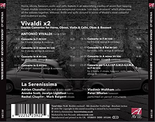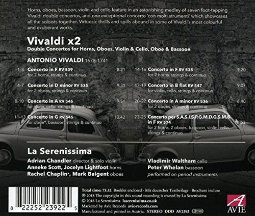 Product Description “My heart skipped a beat when [The Italian Job] from La Serenissima and Adrian Chandler landed on my desk, such was my enjoyment of their Gramophone Awards-shortlisted Vivaldi Four Seasons recording. So to discover that with this all-Italian assortment of sinfonias and concertos they’ve actually topped their 2016 triumph- and apparently effortlessly- gives me no small amount of pleasure.” So said the reviewer of the Gramophone Award-winning release, and the Vivaldi specialists are set to triumph once again with Vivaldi x2, an astonishing medley of double concertos for hunting horns, oboes, bassoon, violin and cello. Emanating from Vivaldi’s pen the double concerto- a genre of which he all but cornered the market- resulted in some of the composer’s most colorful and exuberant works. In the hands of two-time Gramophone Award-winning La Serenissima, these concertos come to virtuosic and effervescent life. “Were I asked to condense this review down to two simple words, they would be: buy it.” (Gramophone) “the freshness incinerates the cobwebs of familiarity in the heat of La Serenissima’s proselytizing zeal.” (BBC Music Magazine Concerto Choice) Review ”Chandler s vehement dedication to the composer s lesser-known works has done much to redress their exclusion from the modern canon and, with the help of seven of his ensemble s soloists, he makes a compelling case for their expressive individuality.” –WQXR Best of July