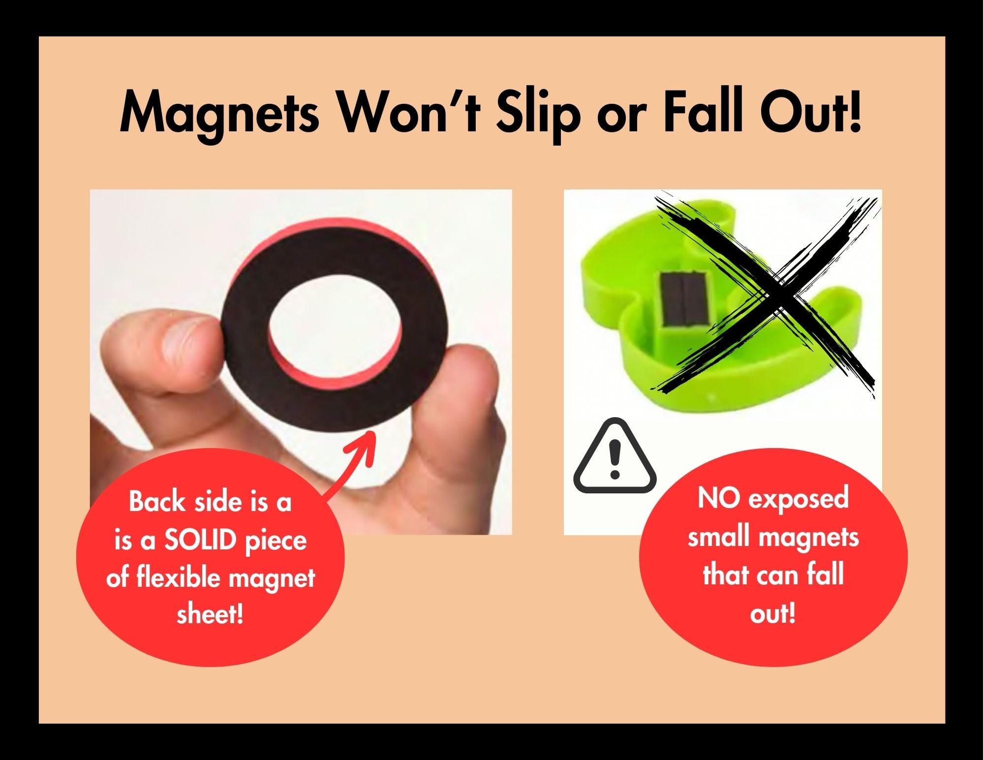 - NON-SLIP MAGNET DESIGN: Back sides of magnets are solid pieces of flexible magnet sheet–prevents slipping. No hard magnets to come loose! Ideal foam magnets for whiteboard, fridge, or lapboards.