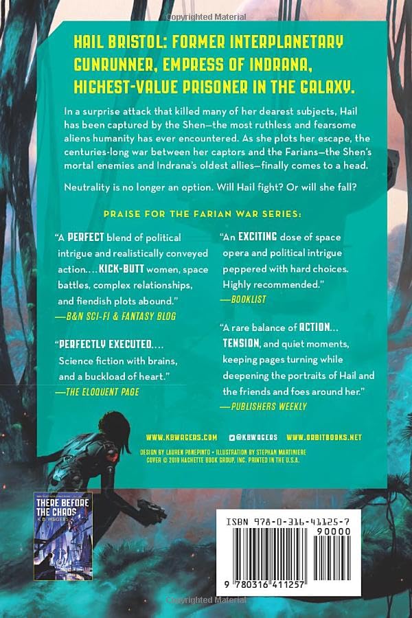 Gunrunner empress Hail Bristol must navigate alien politics and deadly plots to prevent an interspecies war, in this second novel of the Farian War space opera trilogy. In a surprise attack that killed many of her dearest subjects, Hail Bristol, empress of Indrana, has been captured by the Shen — the most ruthless and fearsome aliens humanity has ever encountered. As she plots her escape, the centuries-long war between her captors and the Farians, their mortal enemies and Indrana’s oldest allies, finally comes to a head. When her captors reveal a shocking vision of the future, Hail must make the unexpectedly difficult decision she’s been avoiding: whether to back the Shen or the Farians. Staying neutral is no longer an option. Will Hail fight? Or will she fall? Praise for The Farian War Trilogy: “Action- and emotion-packed, folding political tension, personal relationships, and trauma into a vivid space opera that does not pull any punches.” –Library Journal (starred review) “An exciting dose of space opera and political intrigue peppered with hard choices. Highly recommended!” –Booklist “Twisty and clever and magnificent, full of political maneuvers, space action, and genuine feeling.” –Beth Cato, author of The Clockwork Dagger The Farian War Trilogy There Before the Chaos Down Among the Dead Out Past the Stars For more from K. B. Wagers, check out: Indranan War Trilogy Behind the Throne After the Crown Beyond the Empire