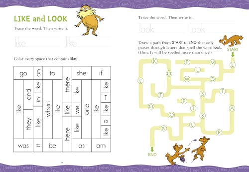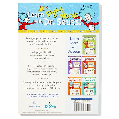UNLOCK READING SUCCESS AND LEARN SIGHT WORDS WITH DR. SEUSS! This delightfully friendly workbook helps kids ages 5 to 7 learn 120 need-to-know sight words for beginning readers. With familiar characters like the Lorax, plus more than 80 pages of fun activities, it’s perfect for kindergartners, 1st graders, and any young reader who wants to improve their reading comprehension and fluency. Developed by education experts, this Dr. Seuss Workbook gives kids a fun and cheerful way to learn common high-frequency sight words! Sight words are words that kids learn to recognize automatically without needing to sound out the letters, often through repetition. Together with phonics and decodable words, sight words are an essential part of early reading success. SIGHT WORDS LEVEL 1 is perfect for kindergartners, 1st graders, and any young learner who needs extra reinforcement with the sight words commonly encountered in classrooms and at kindergarten reading levels. Packed with plenty of practice, this workbook also includes tracing, coloring, and a completion certificate for added fun! Also available from the Dr. Seuss Workbooks line: Dr. Seuss Sight Words Level 2 Workbook Dr. Seuss Phonics Level 1 Workbook Dr. Seuss Phonics Level 2 Workbook Dr. Seuss Handwriting Workbook Dr. Seuss Workbook: Kindergarten Dr. Seuss Workbook: Grade 1
