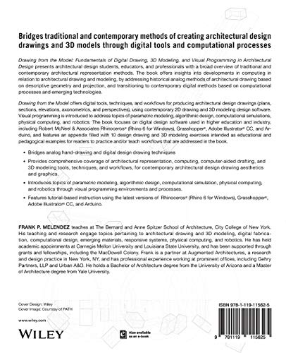 Bridges traditional and contemporary methods of creating architectural design drawings and 3D models through digital tools and computational processes Drawing from the Model: Fundamentals of Digital Drawing, 3D Modeling, and Visual Programming in Architectural Design presents architectural design students, educators, and professionals with a broad overview of traditional and contemporary architectural representation methods. The book offers insights into developments in computing in relation to architectural drawing and modeling, by addressing historical analog methods of architectural drawing based on descriptive geometry and projection, and transitioning to contemporary digital methods based on computational processes and emerging technologies. Drawing from the Model offers digital tools, techniques, and workflows for producing architectural design drawings (plans, sections, elevations, axonometrics, and perspectives), using contemporary 2D drawing and 3D modeling design software. Visual programming is introduced to address topics of parametric modeling, algorithmic design, computational simulations, physical computing, and robotics. The book focuses on digital design software used in higher education and industry, including Robert McNeel & Associates Rhinoceros(r)(Rhino 6 for Windows), Grasshopper(r), Adobe Illustrator(r) CC, and Arduino, and features an appendix filled with 10 design drawing and 3D modeling exercises intended as educational and pedagogical examples for readers to practice and/or teach workflows that are addressed in the book. Bridges analog hand-drawing and digital design drawing techniques Provides comprehensive coverage of architectural representation, computing, computer-aided drafting, and 3D modeling tools, techniques, and workflows, for contemporary architectural design drawing aesthetics and graphics. Introduces topics of parametric modeling, algorithmic design, computational simulation, physical computing, and robotics through visual programming environments and processes. Features tutorial-based instruction using the latest versions of Rhinoceros(r) (Rhino 6 for Windows), Grasshopper(r), Adobe Illustrator(r) CC, and Arduino.
