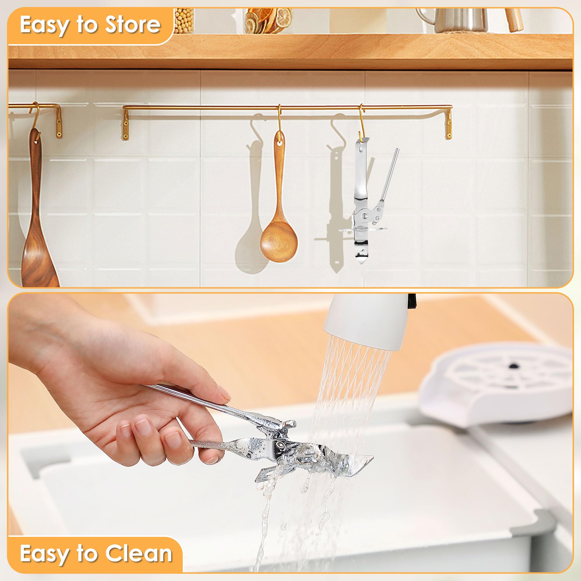 - Easy To Clean: This stainless steel can opener can be easily cleaned by hand washing with warm water and soap, and the gears are wrapped with ABS material to effectively prevent rust. The perforated design on the handle allows you to hang it to dry after washing and for daily storage. The compact design makes the rust proof can opener fit in your kitchen drawers and cabinets