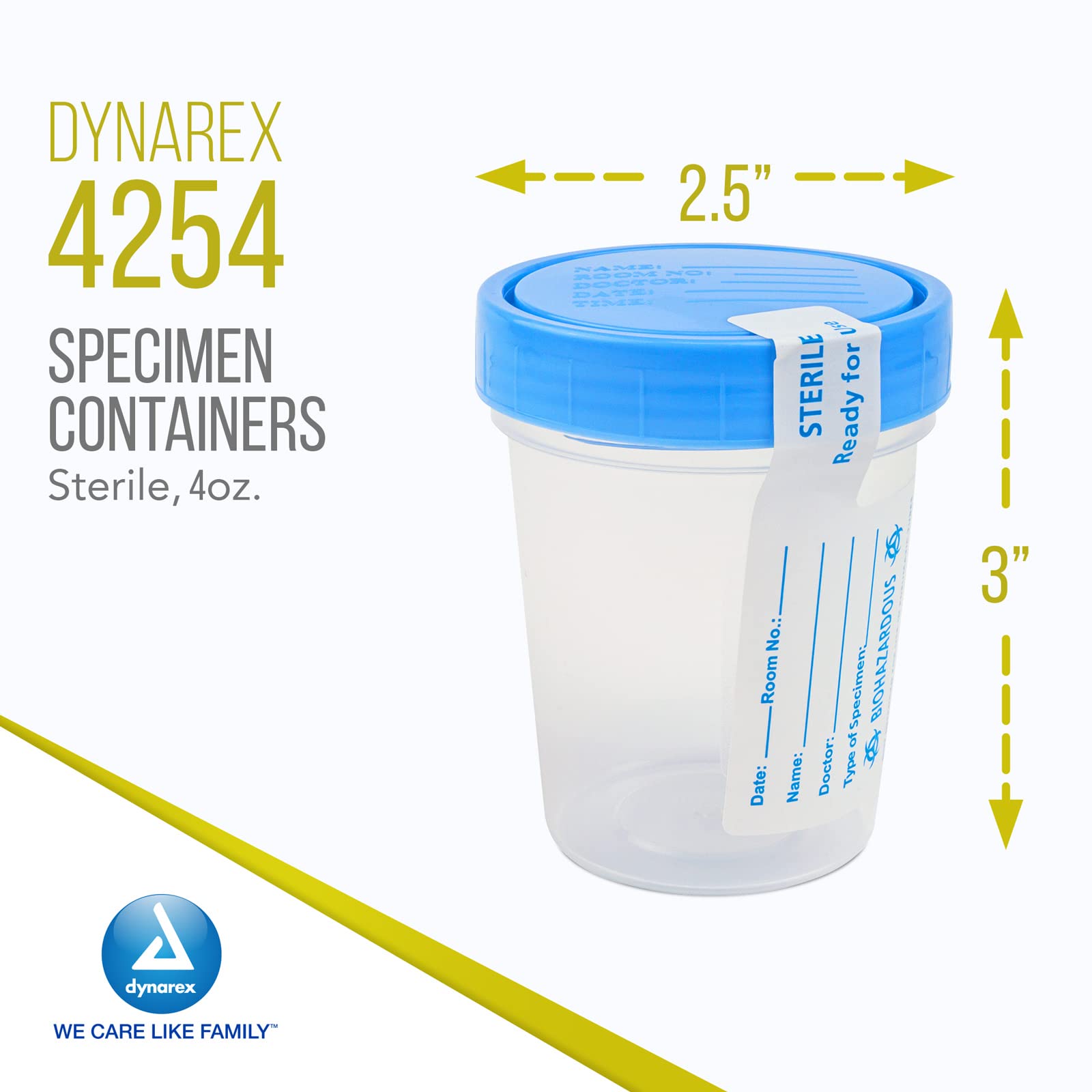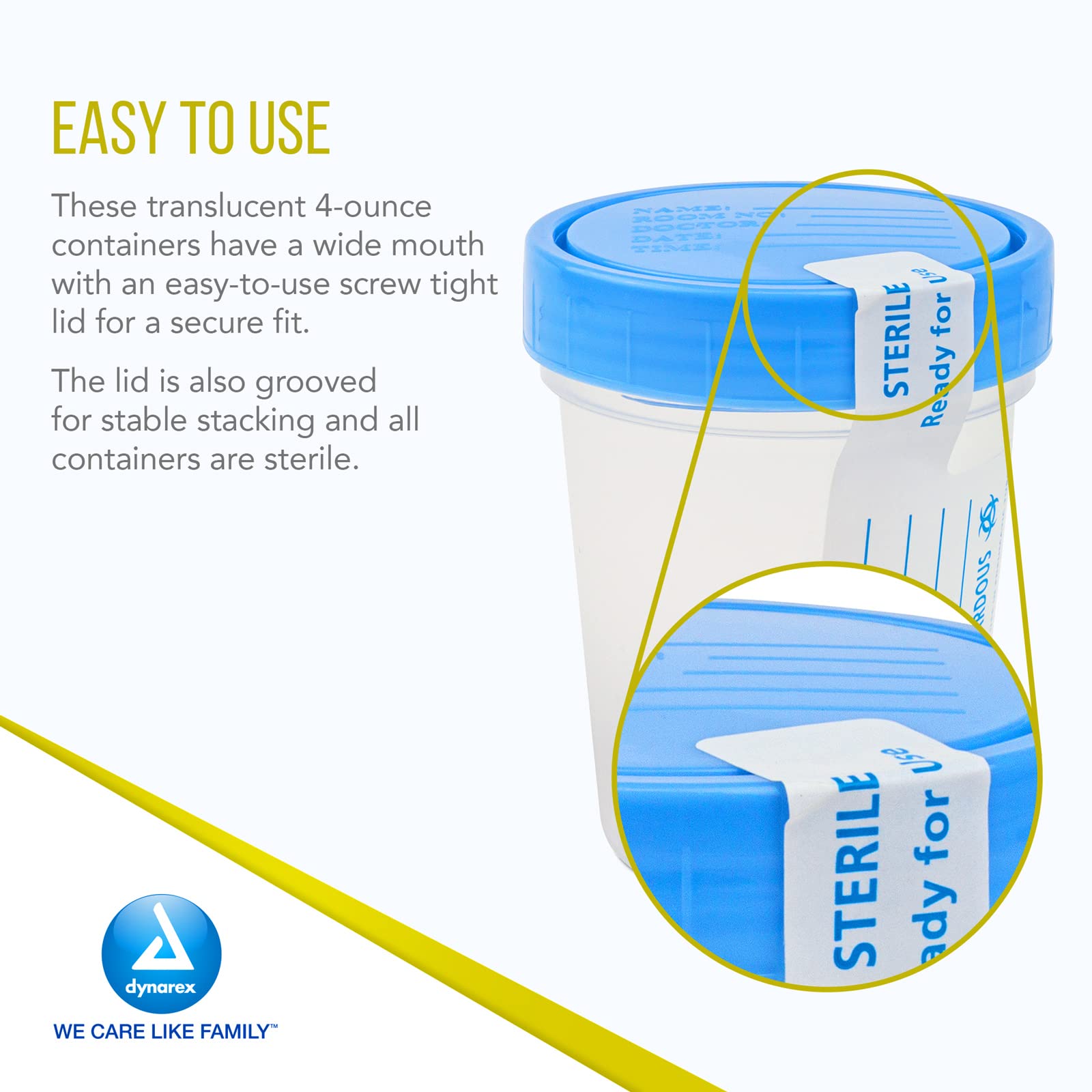 - USED BY MEDICAL PROFESSIONALS: The Dynarex Specimen Containers are sterile and used by various health care workers in medical, drug testing and rehabilitation facilities, long term care residences, fertility clinics, and during home health care visits.