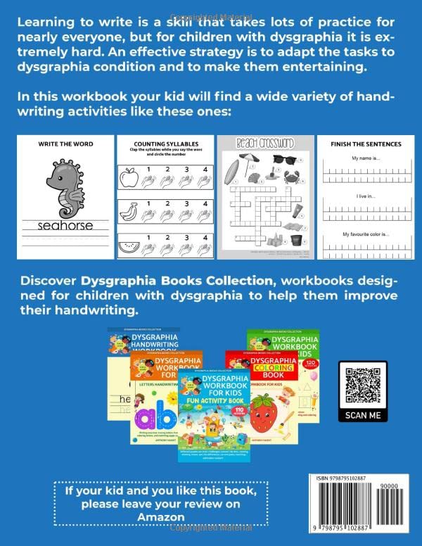 Dysgraphia: Handwriting workbook for kids. Tracing tasks, writing exercices, spelling words, missing letters, counting syllables, and crosswords. (Dysgraphia Books Collection)
