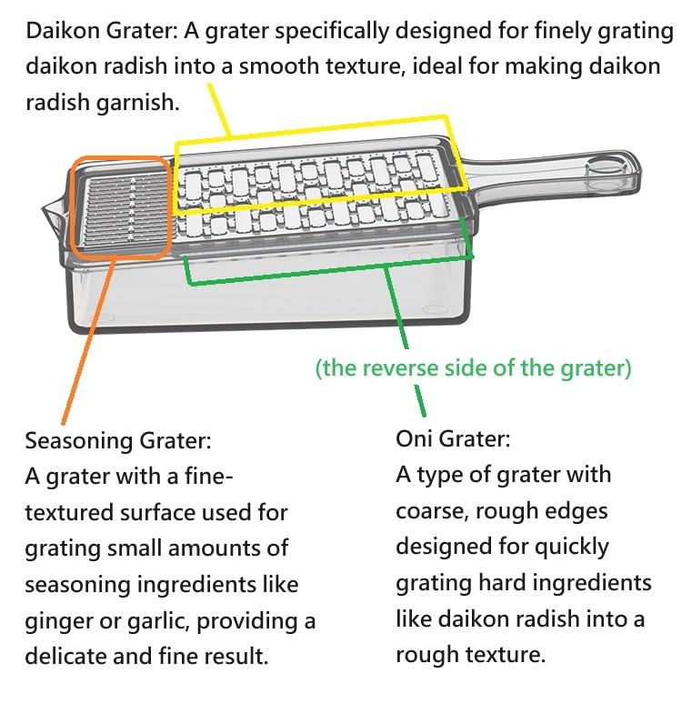 - Versatile Use : This grater can be used not only for daikon radish but also for various root vegetables and seasonings such as carrots, yam, lotus root, ginger, garlic, and wasabi. It can also be used to grate toppings for various dishes like fried foods, fish, meat, noodles, and mochi, enhancing your meals.