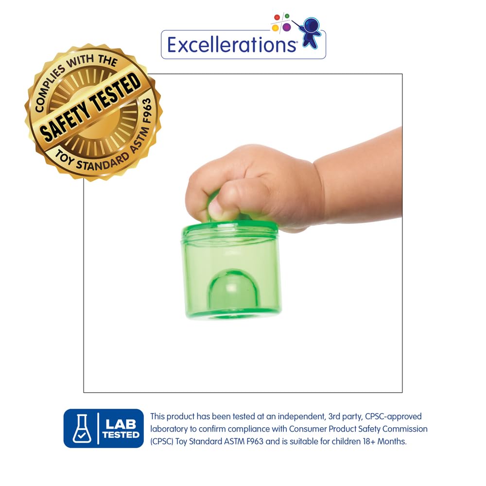 These colorful and chunky pegs are perfect for learning the primary colors and fun manipulative play. Toddlers can enjoy tactile exploration while fitting items together and explore many possibilities by placing the pegs in various color patterns. Includes 18 stackable translucent pegs great for light table play. Six double-sided activity cards and comes complete with storage. Dishwasher safe.