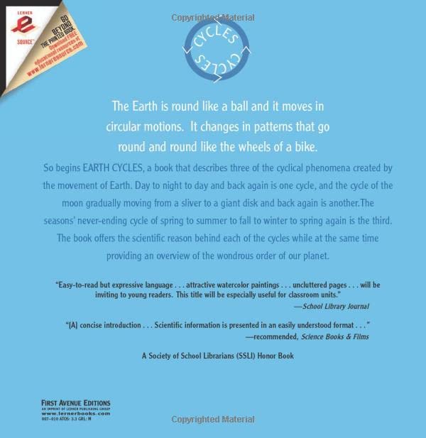 The Earth is round like a ball and it moves in circular motions. It changes in patterns that go round and round like the wheels of a bike. So begins EARTH CYCLES, a book that describes three of the cyclical phenomena created by the movement of Earth. Day to night to day and back again is one cycle, and the cycle of the moon gradually moving from a sliver to a giant disk and back again is another. The seasons’ never-ending cycle of spring to summer to fall to winter to spring again is the third. The book offers the scientific reason behind each of the cycles while at the same time providing an overview of the wondrous order of our planet.