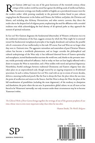 East and West, first published in 1924, was the fourth of a series of books that cleared the ground for Guenon’s later writings. His first book, Introduction to the Study of the Hindu Doctrines (1921), was an exposition of metaphysics as transmitted in the Hindu tradition, and served to establish his specific use of important terms such as ‘esoterism’, ‘tradition’, and ‘orthodoxy’. He next set about writing two extensive volumes critiquing what he called ‘pseudo-esoteric’ groups. The first of these, Theosophy: History of a Pseudo-Religion (1921), is an expose of Madame Blavatsky’s Theosophical Society; the second, The Spiritist Fallacy (1923), examines the current of nineteenth-century spiritism that set the stage for many occult movements that appeared toward the end of that century. Guenon’s application of traditional metaphysics to the special case of pseudo-esoteric groups was then broadened in the present book to the general question of East and West as conservators and transmitters of traditional wisdom in the modern age. The titles of its two parts, ‘Western Illusions’ and ‘How the Differences Might be Bridged’, describe perfectly the book’s intention. Later books, especially The Crisis of the Modern World and its magisterial sequel, The Reign of Quantity and the Signs of the Times, further extended Guenon’s penetrating critique of the modern world.