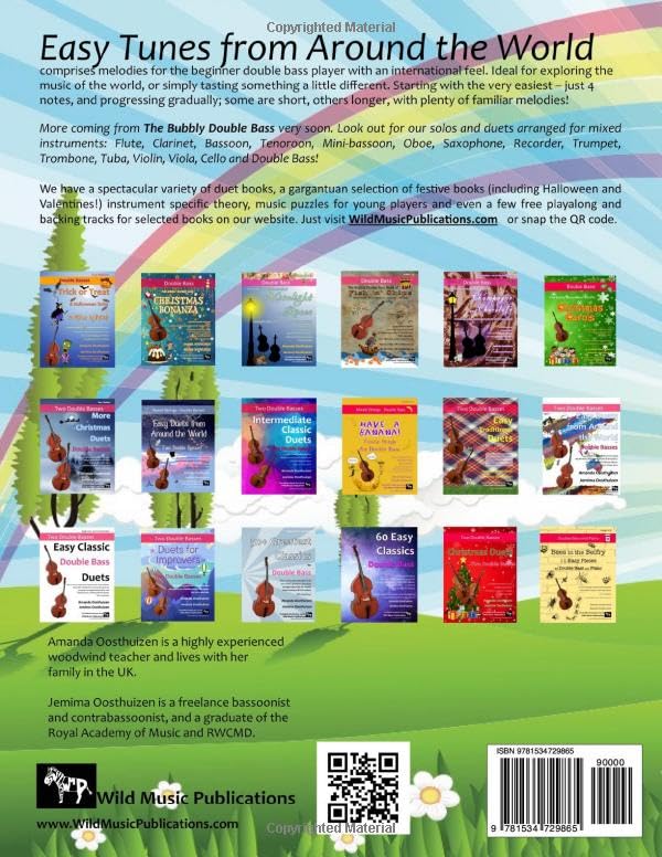 Easy Tunes from Around the World for Double Bass comprises over 70 melodies and rounds from 38 countries arranged for the beginner double bass player, starting with the easiest. Ideal for exploring international music or simply tasting something a little different. Starting with the very easiest – just 4 notes, and progressing; some are very short, others longer, with plenty of familiar melodies included as well. All are playable in first and half position. Great for sight reading practice. Includes: A Canoa Virou * Ah Ya Zein * All Around My Hat * Anoj pusej ezera * Aura Lee * !Ay, Carmela! * Banaha * Banyan Tree * Bella Ciao * Boat on Lake * Caimarusa * Carrickfergus * Clown Dance * Dame Tartine * De Colores * Dynom Danom * Ej, pada, pada rosicka * El coqui * El tortillero * Everybody Loves Saturday Night * Famba Naye * French Round * Garoon Garoon * Giants * Go Down Moses * Golden Glory * Have Nagoya * Hej, Sokoly * Hey Ho, Nobody At Home * Hine e Hine * House of the Rising Sun * Huachito torrito * I Love Sixpence * In Spain * Izika Zumba* J’ai du bon tabac * Jiana * Johnny Todd * Kakke Kakke Koodevide * Kein schoner Land in dieser Zeit * Kisnay Baniya * Kookaburra * La Bergamesca * La Folia * Lightly Row * Lullaby (Basque) * Lullaby (Polish) * Milo Mou Kokkino * Miss Lucy Long * My Bird is Dead * My Dame Hath a Lame Tame Crane * Nar I bogenes duftende sal * Nini ya Moumou* Obwisana * Oi Sermusnio * Old MacDonald * Obwisana * Paper Hat * Pokarekare ana * Rosen fra Fyn * Seal Woman’s Lament * Shake the Papaya Down * Shashari * Shenandoah * Sitsiritsit Alibangbang * Siyahamba * Skip to my Lou * Sleep Sleep * Sly Mongoose * Soley * Spanish Ladies * Stodola Pumpa * Tavaszi szel vizet araszet * The Cuckoo * The Hunt * The Old Tree * The Saints * The Three Friends * The Three Ravens * The Yak * This Old Man * Tsetang Choung-La * Tumbalalaika * Twinkle Twinkle * Ty Zh Mene Pidmanula * Vem kan segla forutan vind? * When I First Came to This Land * Whisky Johnny * Yangtse Boatman * Yankee Doodle * Y Deryn Pur * More coming from The Bubbly Bass very soon. Look out for our solo, duet and trio music arranged for mixed instruments: Flute, Clarinet, Bassoon, Oboe, Saxophone, Recorder, Trumpet, Trombone, Tuba, Violin, Viola, Cello and Double Bass, Mini-bassoon, Tenoroon, Guitar etc. We have a spectacular variety of duet books, a gargantuan selection of festive books (including Christmas, Valentine’s and Halloween!), instrument-specific theory, including theory puzzles for very young players and even downloadable playalong and backing tracks and sheet music on our website. Just visit WildMusicPublications.com For tweets on our latest books, why not follow us on Twitter? @wmpublications Testimonials Hi there – I’m just emailing you to tell you how much I love your Oboe duet books, especially the vast range of Christmas music! I have all of them! I’m an oboe and double bass teacher (I know!) based in Dublin, and I am very much a Christmas enthusiast. I’m known among my students for wearing Christmas socks 365 days a year (they’ve checked!!) I’ve taken on some double bass students this year, and I’ll be buying your double bass Xmas duets to play with them. Given the brilliance of the oboe books, I’m really looking forward to it. Many thanks and keep up the good work! Eimear Hi there! I have been really impressed with your books! I have been wishing for a long time there was such a thing as instrument specific theory books, and now I’ve found them. I intend to get your whole selection of flute books- they are excellent. I just wanted to tell you how great I think your books are! Thank you ever so much- I will continue to use you and to recommend you to others xxx Janine Your music books are great for beginners and improvers and the duet books are very well constructed. Ellen I am loving your books. Jessie