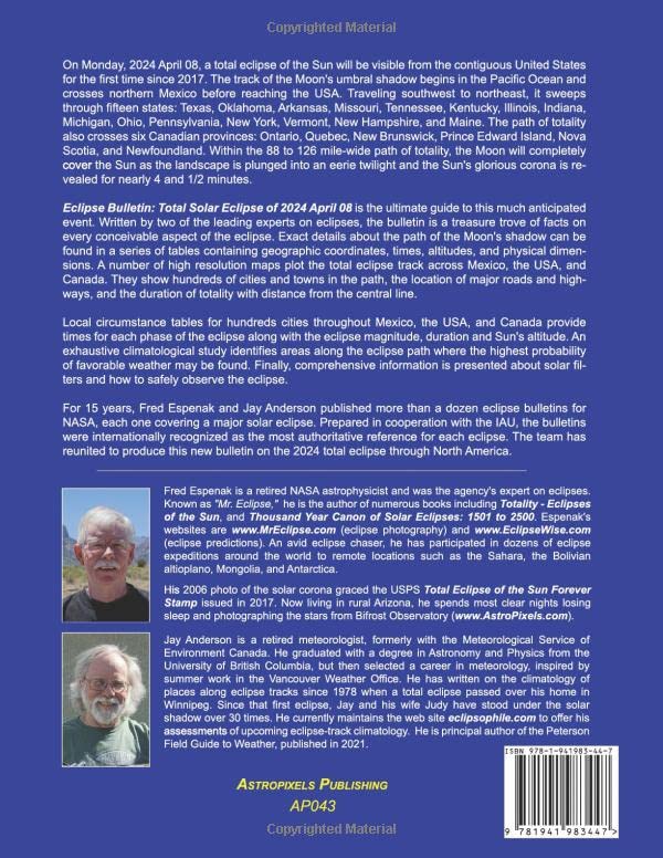 On Monday, 2024 April 08, a total eclipse of the Sun will be visible from the contiguous United States for the first time since 2017. The track of the Moon’s umbral shadow begins in the Pacific Ocean and crosses northern Mexico before reaching the USA. Traveling southwest to northeast, it sweeps through fifteen states: Texas, Oklahoma, Arkansas, Missouri, Tennessee, Kentucky, Illinois, Indiana, Michigan, Ohio, Pennsylvania, New York, Vermont, New Hampshire, and Maine. The path of totality also crosses six Canadian provinces: Ontario, Quebec, New Brunswick, Prince Edward Island, Nova Scotia, and Newfoundland. Within the 88 to 126 mile-wide path of totality, the Moon will completely cover the Sun as the landscape is plunged into an eerie twilight and the Sun’s glorious corona is revealed for nearly 4 and 1/2 minutes. Eclipse Bulletin: Total Solar Eclipse of 2024 April 08 – Color Edition is the ultimate guide to this much anticipated event. Written by two of the leading experts on eclipses, the bulletin is a treasure trove of facts on every conceivable aspect of the eclipse. Exact details about the path of the Moon’s shadow can be found in a series of tables containing geographic coordinates, times, altitudes, and physical dimensions. A number of high resolution maps plot the total eclipse track across Mexico, the USA, and Canada. They show hundreds of cities and towns in the path, the location of major roads and highways, and the duration of totality with distance from the central line. Local circumstance tables for hundreds cities throughout Mexico, the USA, and Canada provide times for each phase of the eclipse along with the eclipse magnitude, duration and Sun’s altitude. An exhaustive climatological study identifies areas along the eclipse path where the highest probability of favorable weather may be found. Finally, comprehensive information is presented about solar filters and how to safely observe the eclipse. For 15 years, Fred Espenak and Jay Anderson published more than a dozen eclipse bulletins for NASA, each one covering a major solar eclipse. Prepared in cooperation with the IAU, the bulletins were internationally recognized as the most authoritative reference for each eclipse. The team has reunited to produce this new bulletin on the 2024 total eclipse through North America.
