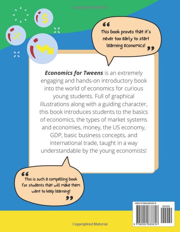Economics for Tweens is an extremely engaging and hands-on introductory book into the world of economics for curious young students. Full of graphical illustrations along with a guiding character, this book introduces students to the basics of economics, the types of market systems and economies, money, the US economy, GDP, basic business concepts, and international trade, taught in a way understandable by the young economists!