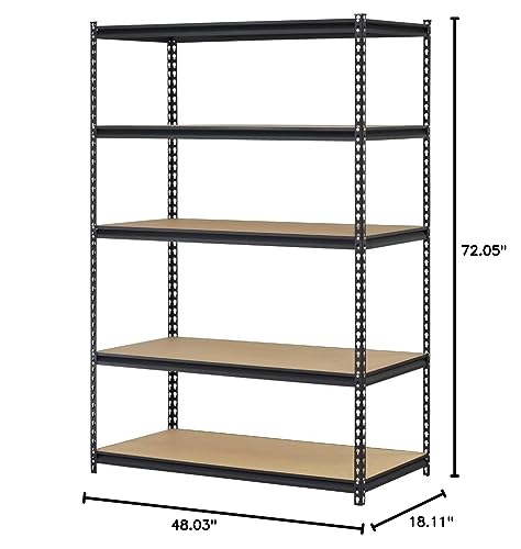 Clear some clutter out of your utility room, workroom, or garage and keep all your tools and supplies right where you can find them with the Edsal 5 Shelf 4000 Pound Adjustable Storage Rack Shelves. Easy to assemble, this shelving unit features a rivet locking design for bolt less assembly. The robust construction with riveted beams and braces lock into corner post rivet holes, and the rivet holes are punched at 1.5 increments so you can customize shelf height. The whole self unit stands at 48 inches wide and 72 inches high for a design that maximizes space. The racks are crafted out of heavy duty powder coated steel to stand up to heavy use for years to come. Invest in the Edsal 5 Shelf 4000 Pound Adjustable Storage Rack Shelves for the gift of storage that keeps on giving. Assembled width: 48″