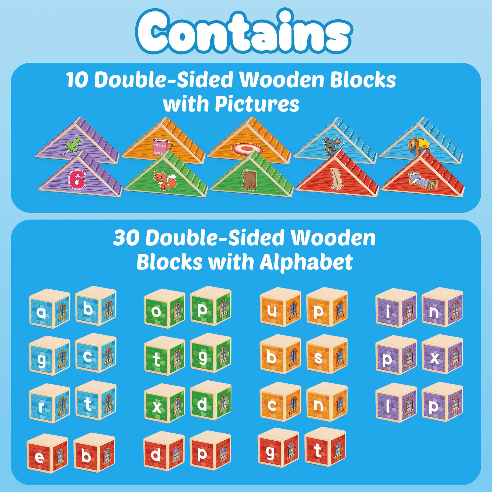 - CVC Word Game + Building Blocks: This product contains 30 wooden blocks with letters and 10 wooden blocks with pictures. Children learn CVC words while building with the blocks, making learning fun. The bright and cute illustrations can attract children’s attention and improve their concentration. This is a fun learning toy.