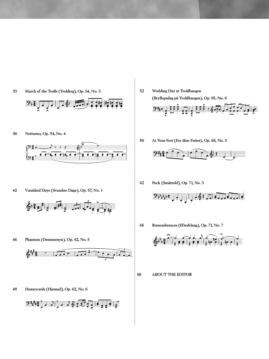 (Schirmer Performance Editions). 18 perennial favorites from Lyric Pieces have been selected for their quality, variety, and pedagogical value. Schirmer Performance Editions are designed for piano students and their teachers as well as for professional pianists. These editions offer insightful interpretive suggestions, pertinent fingering, and historical and stylistic commentary. Prepared by experienced artists and master teachers, these publications provide an accurate, well-informed score resource for pianists. Contents: Arietta, Op. 12, No. 1 * Waltz, Op. 12, No. 2 * Dance of the Elves, Op. 12, No. 4 * Waltz, Op. 38, No. 7 * Butterfly, Op. 43, No. 1 * Solitary Traveler, Op. 43, No. 2 * Little Bird, Op. 43, No. 4 * To the Spring, Op. 43, No. 6 * Shepherd Boy, Op. 54, No. 1 * March of the Trolls, Op. 54, No. 3 * Notturno, Op. 54, No. 4 * Vanished Days, Op. 57, No. 1 * Phantom, Op. 62, No. 5 * Homewards, Op. 62, No. 6 * Wedding Day at Troldhaugen, Op. 65, No. 6 * At Your Feet, Op. 68, No. 3 * Puck, Op. 71, No. 3 * Remembrances, Op. 71, No. 7