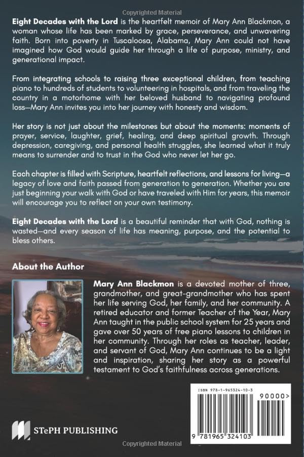 Eight Decades with the Lord is the heartfelt memoir of Mary Ann Blackmon, a woman whose life has been marked by grace, perseverance, and unwavering faith. Born into poverty in Tuscaloosa, Alabama, Mary Ann could not have imagined how God would guide her through a life of purpose, ministry, and generational impact. From integrating schools to raising three exceptional children, from teaching piano to hundreds of students to volunteering in hospitals, and from traveling the country in a motorhome with her beloved husband to navigating profound loss–Mary Ann invites you into her journey with honesty and wisdom. Her story is not just about the milestones but about the moments: moments of prayer, service, laughter, grief, healing, and deep spiritual growth. Through depression, caregiving, and personal health struggles, she learned what it truly means to surrender and to trust in the God who never let her go. Each chapter is filled with Scripture, heartfelt reflections, and lessons for living–a legacy of love and faith passed from generation to generation. Whether you are just beginning your walk with God or have traveled with Him for years, this memoir will encourage you to reflect on your own testimony. Eight Decades with the Lord is a beautiful reminder that with God, nothing is wasted–and every season of life has meaning, purpose, and the potential to bless others.