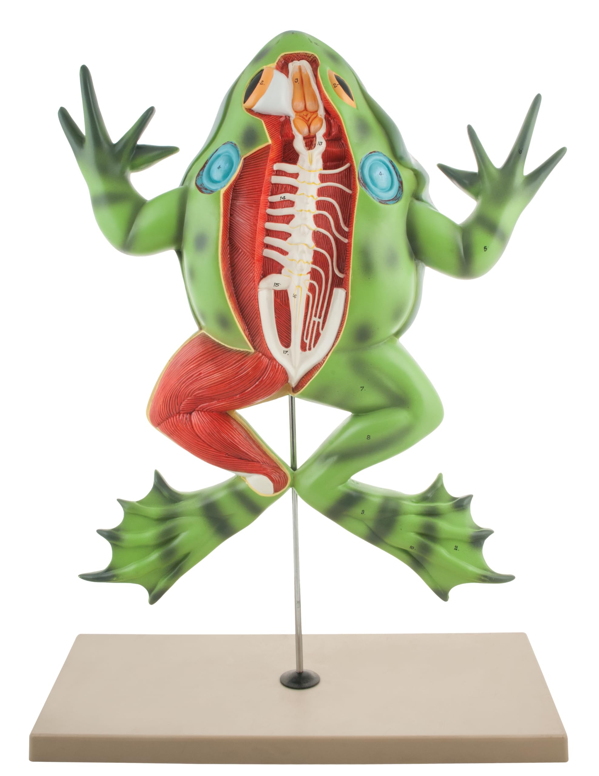 The detailed 3D rendering of a frog dissection with its vibrantly colored anatomy is ideal for studying the structure and function of the basic organs in a frog. Key anatomical parts are colored and numbered for comparison with the anatomy key that is included – all major organs are clearly visible and labeled on the ventral side. The frog is also dissected on the dorsal side to reveal the brain, spinal cord, ribs, nerves, and muscles of the hind leg. The frog itself can also be removed for further manipulation and investigation. This model provides a visually and kinesthetically effective method for studying the structure and function of the anatomy of a frog. It is a particularly useful tool for students who struggle with dissection to understand the basic anatomy that is gleaned from doing a dissection.