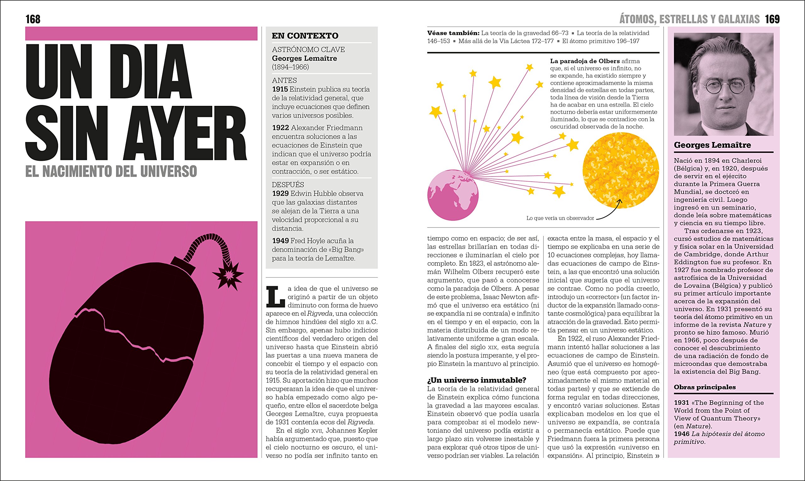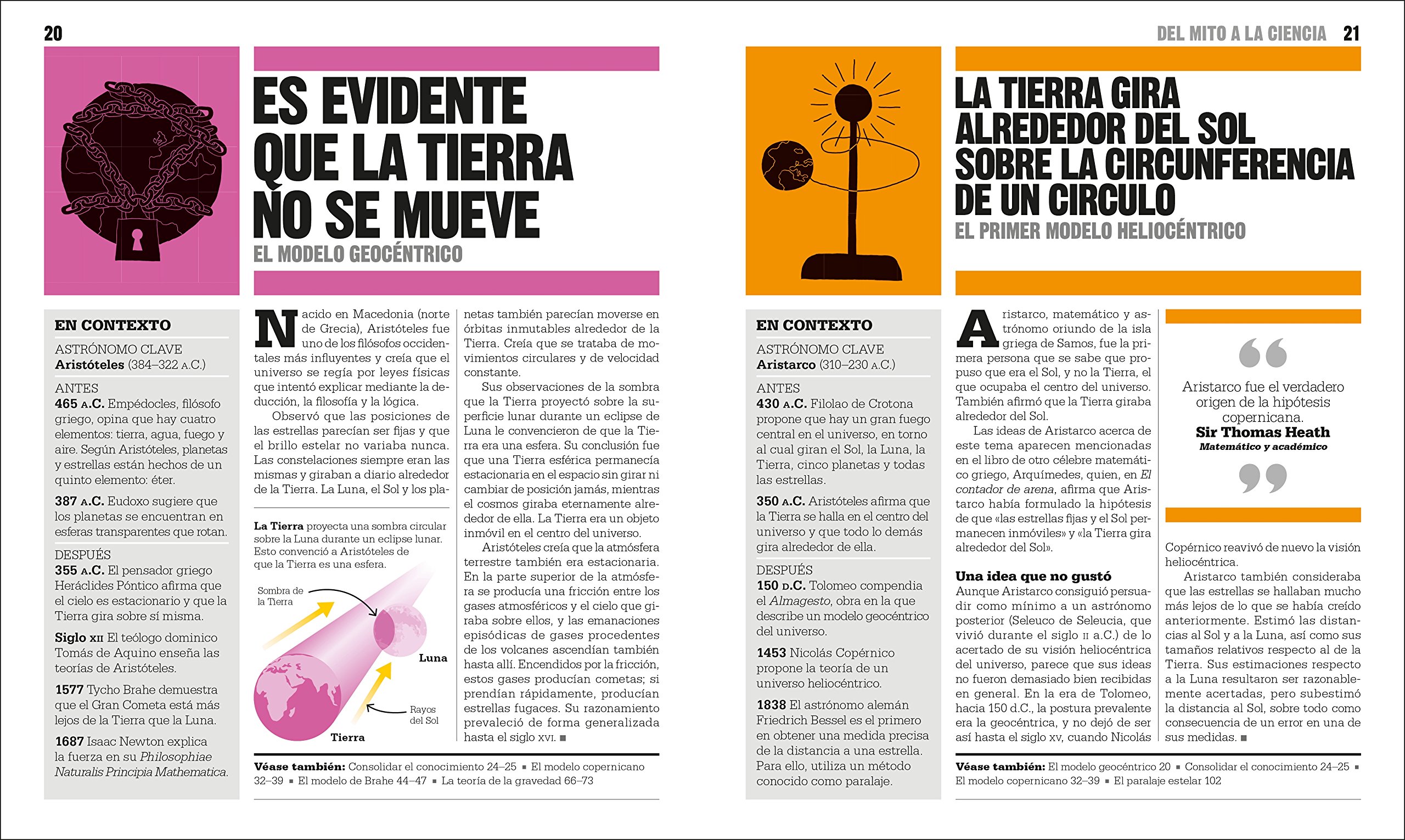 Grandes ideas, explicaciones sencillas Con un lenguaje claro, El libro de la astronomia proporciona breves y sencillas explicaciones que aclaran la jerga cientifica, esquemas que desbrozan complejas teorias, ilustraciones que juegan con nuestro conocimiento de los astros e ingeniosas citas que condensan los descubrimientos astronomicos. ?Como medimos el universo? ?Donde se halla el horizonte de sucesos? ?Que es la materia oscura? Desde los albores de la humanidad, la gente ha alzado la vista al cielo con el afan de entenderlo. Asi, a lo largo de los siglos, la ciencia astronomica ha ensanchado las fronteras del conocimiento humano en el intento de comprender el universo y nuestro lugar en el. Tanto el aprendiz en la materia, como el estudiante o el apasionado por la astronomia, encontraran en este libro en espanol una multitud de ideas interesantes. La astronomia mas cerca que nunca Este magnifico libro de astronomia ilustrado con imagenes digitales increibles relata de una forma didactica la historia de la evolucion de los conocimientos investigados por el hombre a lo largo de miles de anos sobre el Universo. Las cuestiones cosmicas de cada epoca han inspirado grandes ideas para tratar de responderlas. Estos cuestionamientos han dado lugar a avances en la filosofia, las matematicas, la tecnologia y las tecnicas de observacion. Es una obra ideal para sentar las bases de los origenes de la astronomia, conocer como influyen los astros sobre el tiempo y la marea, desvelar curiosidades sobre la astronomia solar, las estrellas, el cosmos, el sistema solar, los atomos y las galaxias, introducirse en la astrofisica y actualizarse en cuanto al impacto que la tecnologia esta teniendo sobre el desarrollo y el conocimiento de esta ciencia. El libro de la astronomia nos muestra una bella mirada al pasado y esboza los hallazgos venideros que posiblemente estableceran nuevos y emocionantes paradigmas. Este maravilloso libro de astronomia clasifica la ensenanza sobre los astros y el cosmos en los siguientes capitulos: * Del mito a la ciencia. 600 A.C.-1550 D.C. * La revolucion del telescopio. 1550-1750 * De Urano a Neptuno. 1750-1850 * El auge de la astrofisica. 1850-1915 * Atomos, estrellas y galaxias. 1915-1950 * Nuevas ventanas al Universo. 1950-1975 * El triunfo de la tecnologia. 1975-Presente El libro de la astronomia pertenece a la galardonada serie Grandes Ideas explica temas complejos de un modo facil de entender mediante explicaciones claras y alejandose del academicismo tradicional. Su creativo diseno y los graficos innovadores que acompanan al texto hacen de esta serie una introduccion perfecta a una gran diversidad de materias para toda la familia.