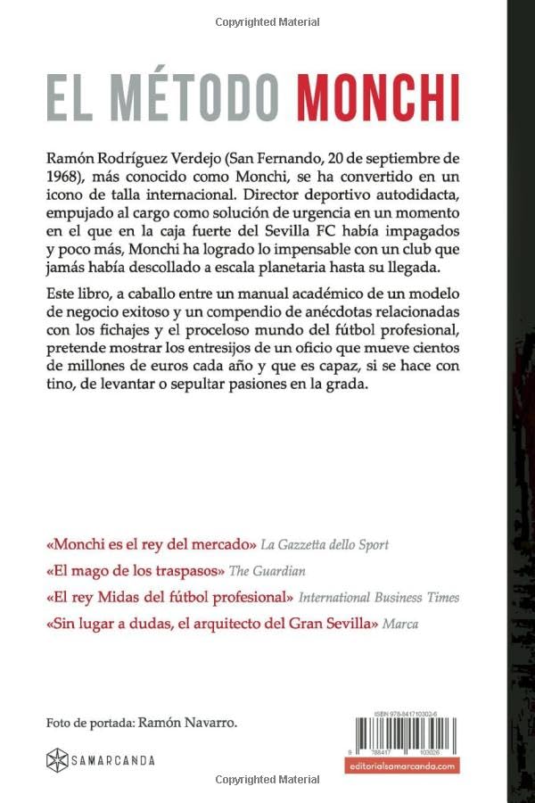 Ramon Rodriguez Verdejo (San Fernando, 20 de septiembre de 1968), mas conocido como Monchi, se ha convertido en un icono de talla internacional. Director deportivo autodidacta, empujado al cargo como solucion de urgencia en un momento en el que en la caja fuerte del Sevilla FC habia impagados y poco mas, Monchi ha logrado lo impensable con un club que jamas habia descollado a escala planetaria hasta su llegada. Este libro, a caballo entre un manual academico de un modelo de negocio exitoso y un compendio de anecdotas relacionadas con los fichajes y el proceloso mundo del futbol profesional, pretende mostrar los entresijos de un oficio que mueve cientos de millones de euros cada ano y que es capaz, si se hace con tino, de levantar o sepultar pasiones en la grada. “Monchi es el rey del mercado”. La Gazzetta dello Sport. “El mago de los traspasos”. The Guardian. “El rey Midas del futbol profesional”. International Business Times. “Sin lugar a dudas, el arquitecto del Gran Sevilla”. Marca.