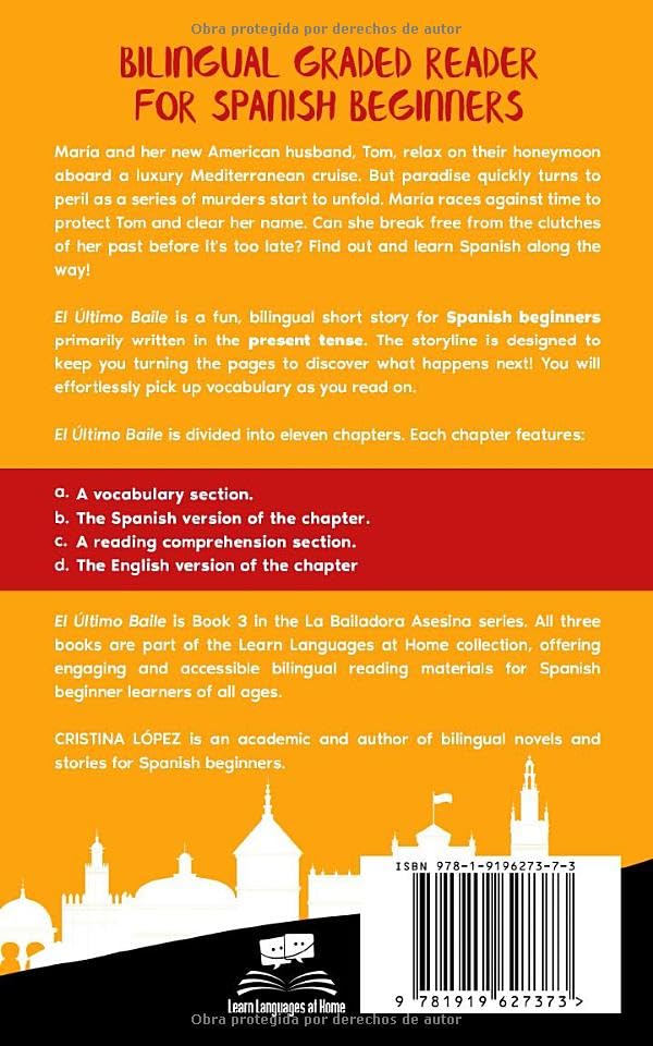 “I’m stunned by my own progress! The sense of achievement is incredible.” Maria relaxes aboard a luxury Mediterranean cruise… but paradise quickly turns to peril as a series of murders start to unfold. She races against time to catch the killer and clear her name. Can she break free from the clutches of her past before it’s too late? Find out and learn Spanish along the way! El Ultimo Baile is BOOK 3 in the La Bailadora Asesina trilogy. It is a fun, bilingual short story intended for beginning Spanish learners. Written primarily in the present tense and following a no-dictionary approach, the story allows you to pick up vocabulary naturally as you read. Its plot is fast and engaging, and will keep you turning pages to discover what happens next! El Ultimo Baile is divided into eleven chapters. Each chapter features: A vocabulary section. The Spanish version of the chapter. A reading comprehension section. The English version of the chapter. El Ultimo Baile is BOOK 3 in the La Bailadora Asesina series. All three books are part of the Learn Languages at Home collection, offering engaging and accessible bilingual reading materials for Spanish beginner learners of all ages. CRISTINA LOPEZ is an academic and author of bilingual novels and stories for Spanish beginners.